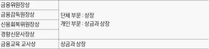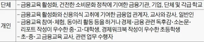 건전한 금융문화 정착을 위해 금융 및 신용 교육 활동을 펼쳐온 단체와 개인, 금융교육에 참여한 학생이면 누구나 응모할 수 있습니다. 특히 중·고·대학생은 경제·금융 관련 도서 독후감과 소논문 등 다양한 형식으로 참여할 수 있습니다.