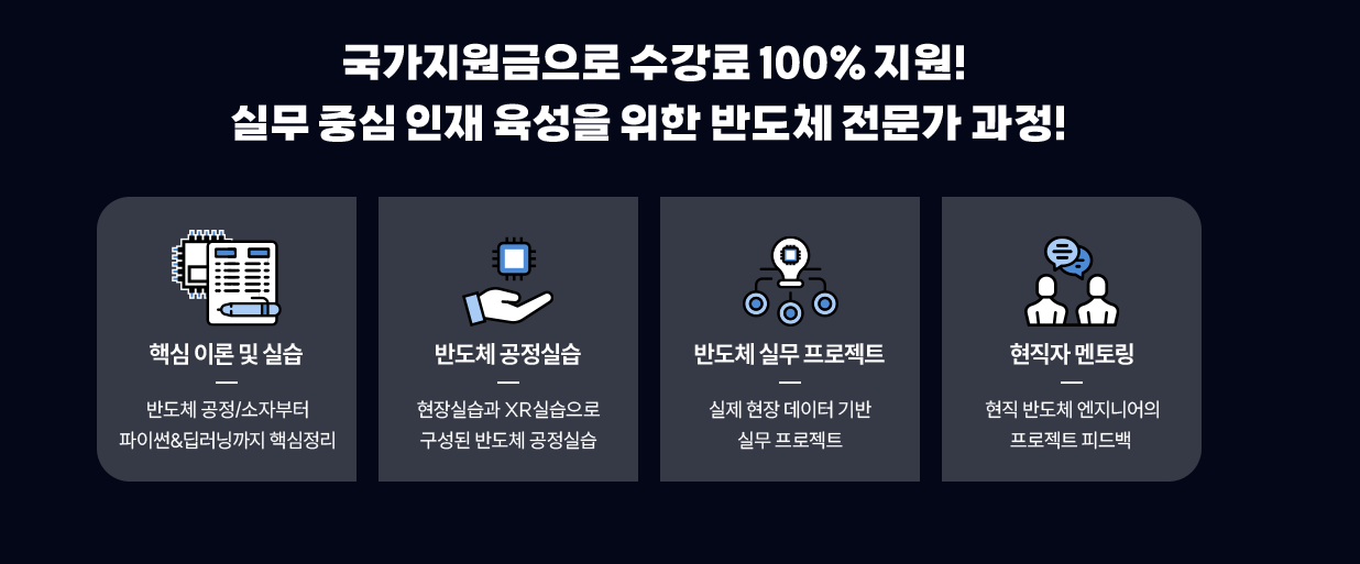 -K-Digital Training 과정은 렛유인에듀와 고용노동부와 함께하는 수강료 전액 100% 무료 국비지원사업으로 실무형 인재로 성장하기 위한 이론, 실습, 프로젝트,멘토링 등으로 구성되어있습니다. 반도체 산업에 필요한 직무 역량을 강화하고 전문성과 실무 경험을 쌓을 수 있는 기회를 제공합니다.