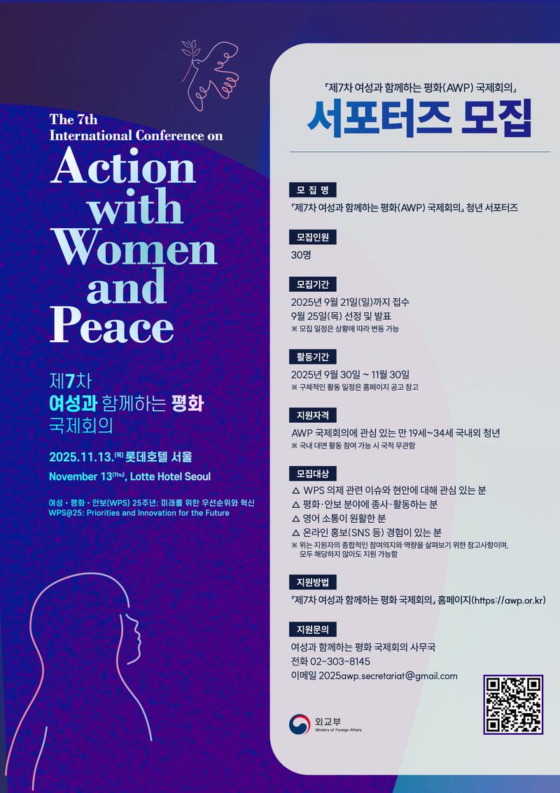 대한민국 외교부에서 주최하는 제7차 여성과 함께하는 평화(AWP) 국제회의의 서포터즈를 모집합니다.