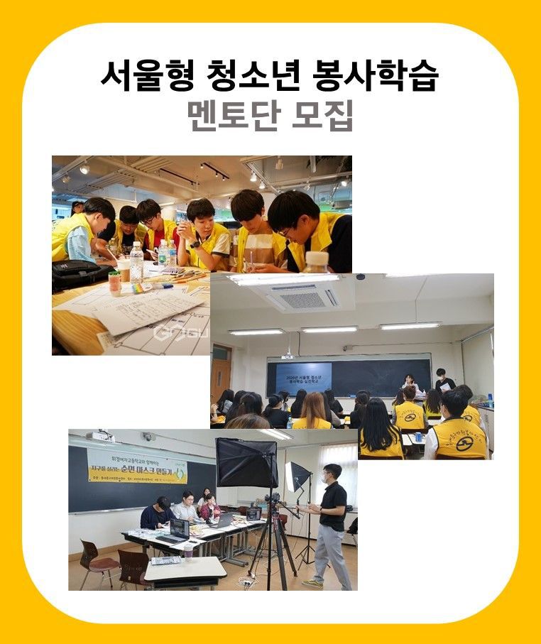 동대문구 3개 고등학교에서 진행하는 청소년 봉사학습에 일일 대학생 멘토를 모집합니다. 각 학교별 일정이 조금씩 다르기 때문에 아래 내용 잘 참고하셔서 지원바랍니다! (중복지원 가능!)