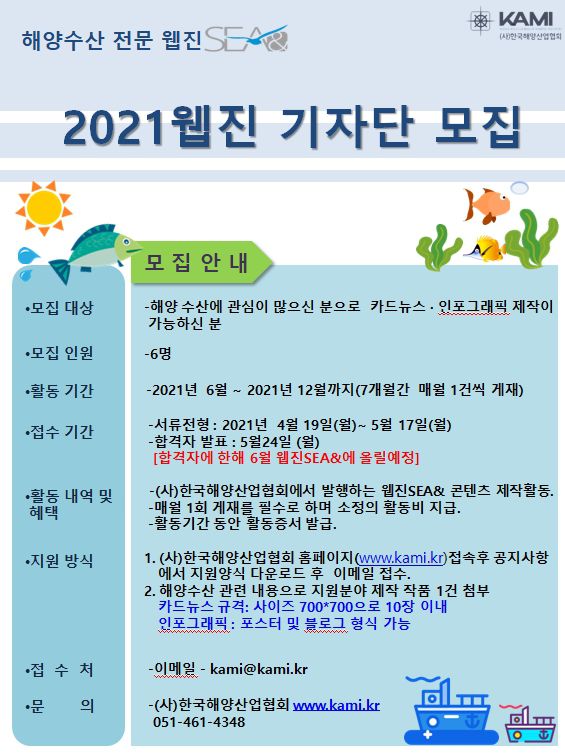 ●모집대상: 해양 수산에 관심이 많은신 분으로 카드뉴스.인포그래픽 (블로스 형식 가능) 제작이 가능하신분을 모집합니다