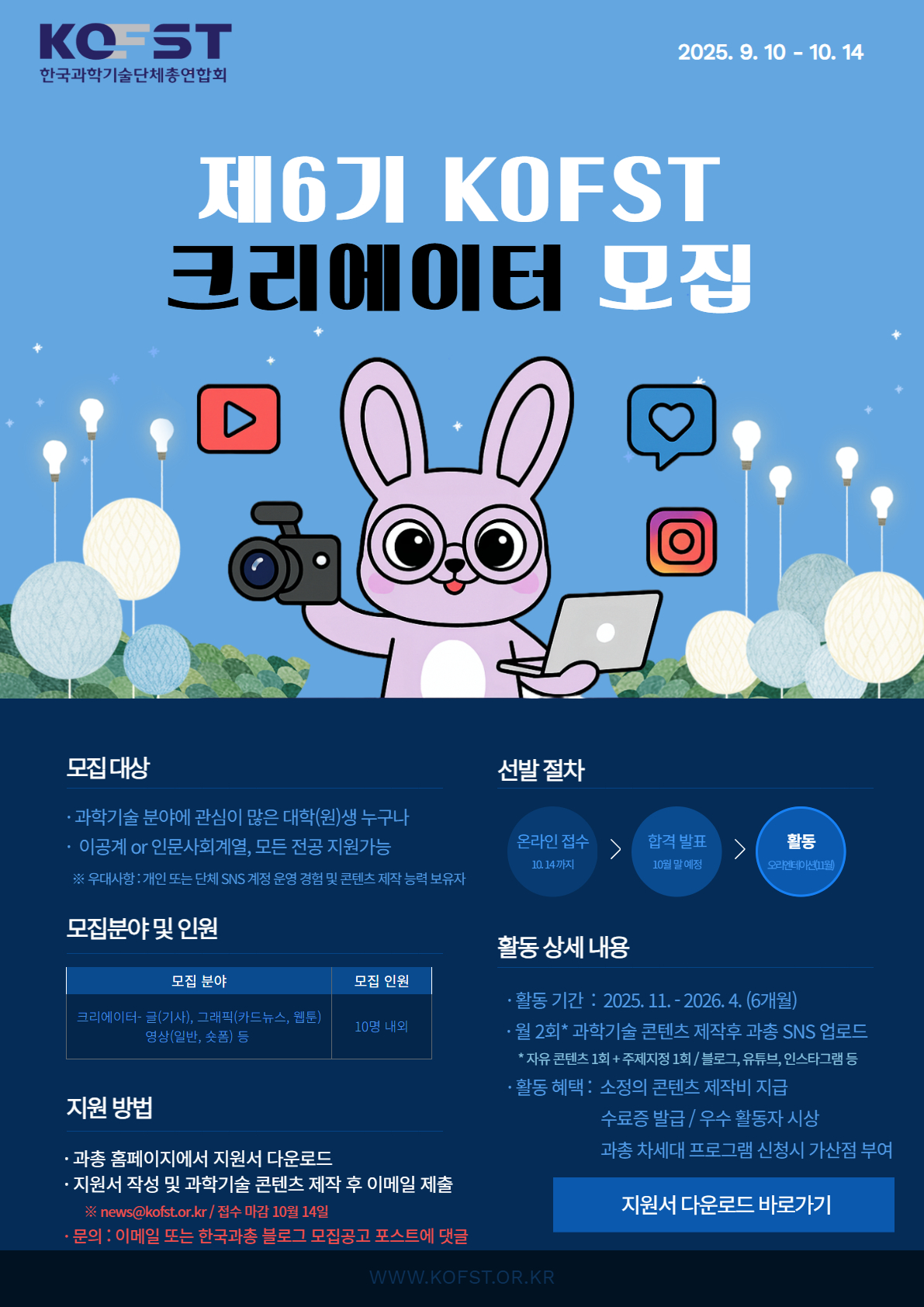 과학문화 대중화에 기여하기 위한 '제6기 KOFST 크리에이터'를 모집 하오니,