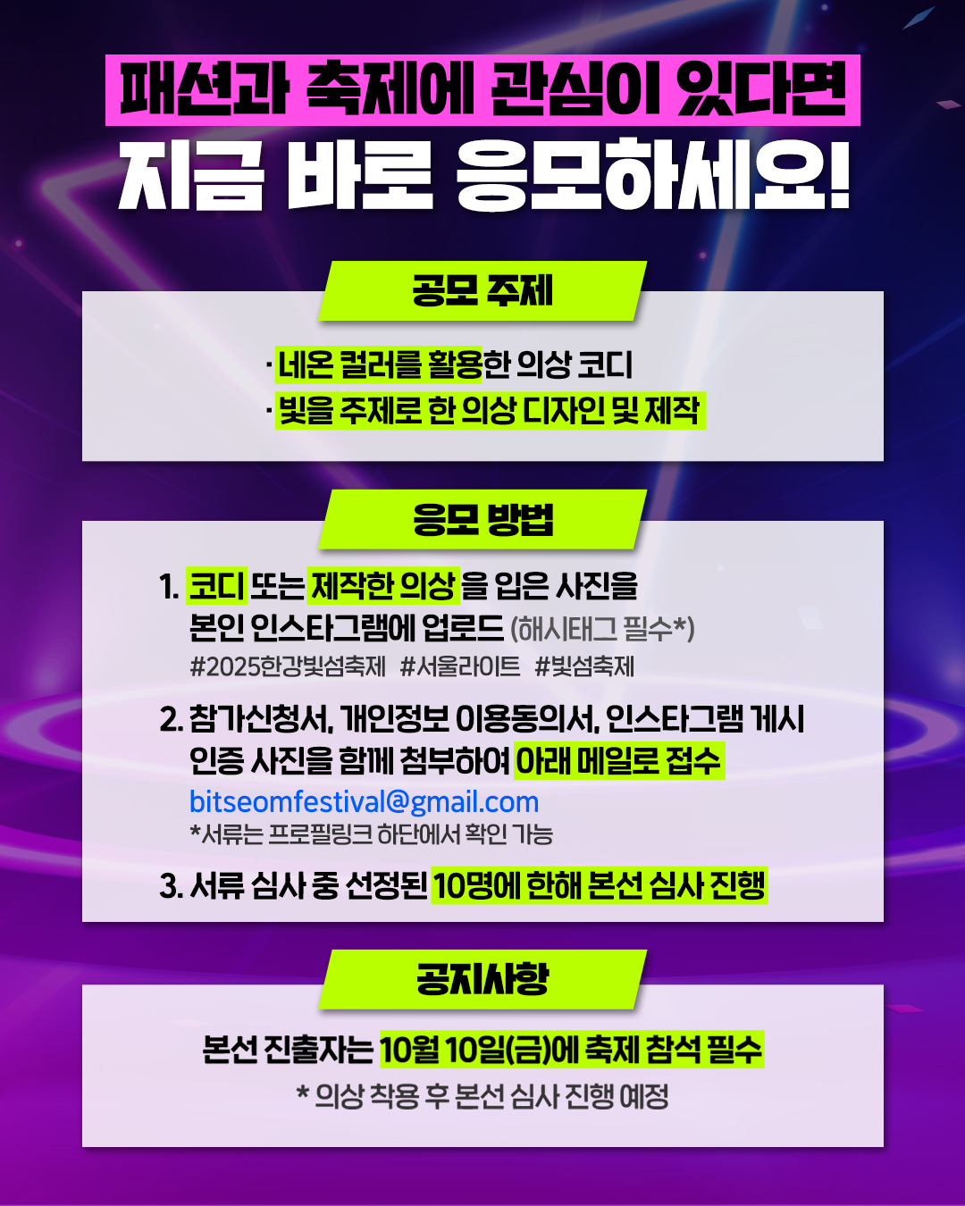 3. 서류 심사 중 선정된 10명에 한해 본선 심사 진행 패션과 축제를 사랑하는 여러분의 많은 참여를 기다립니다! 💖 |