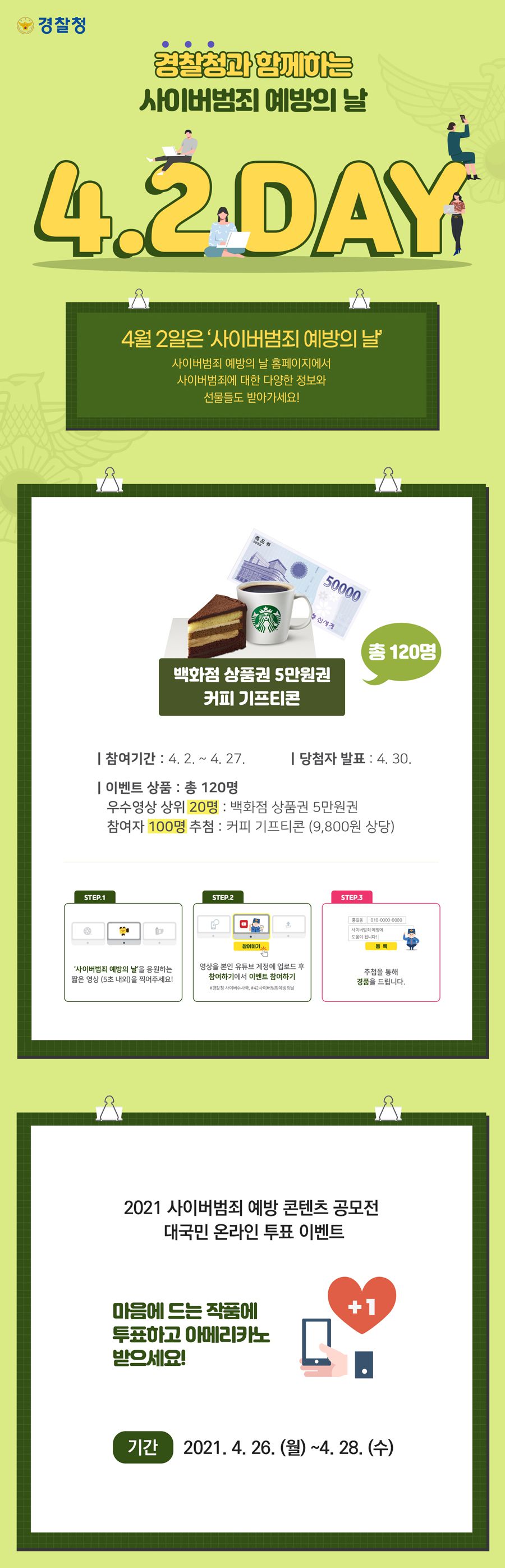 - '사이버범죄 예방 콘텐츠 공모전 온라인 투표 : 4월 26일(월) ~ 28일(수)