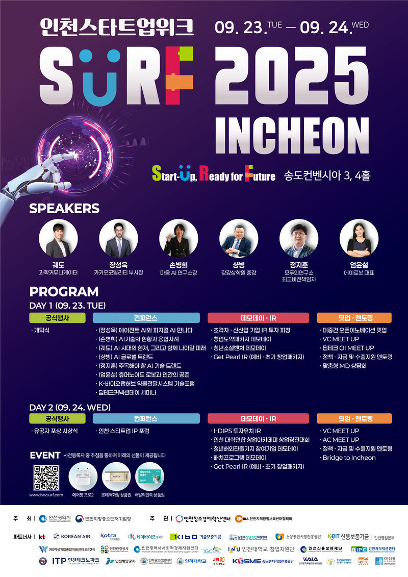 - 올해 3회째를 맞이하는 [SURF 2025 INCHEON]은 AI와 로봇을 주제로 유명 연사 강연과 토크콘서트, 스타트업 제품 전시 및 체험 등 다채롭게 구성되어 있습니다. 행사에 참석하여 최신 산업 트렌드와 혁신적인 기술을 직접 경험하시고, 창업 생태계 관계자들과의 소중한 네트워킹 기회를 가지시길 바랍니다.