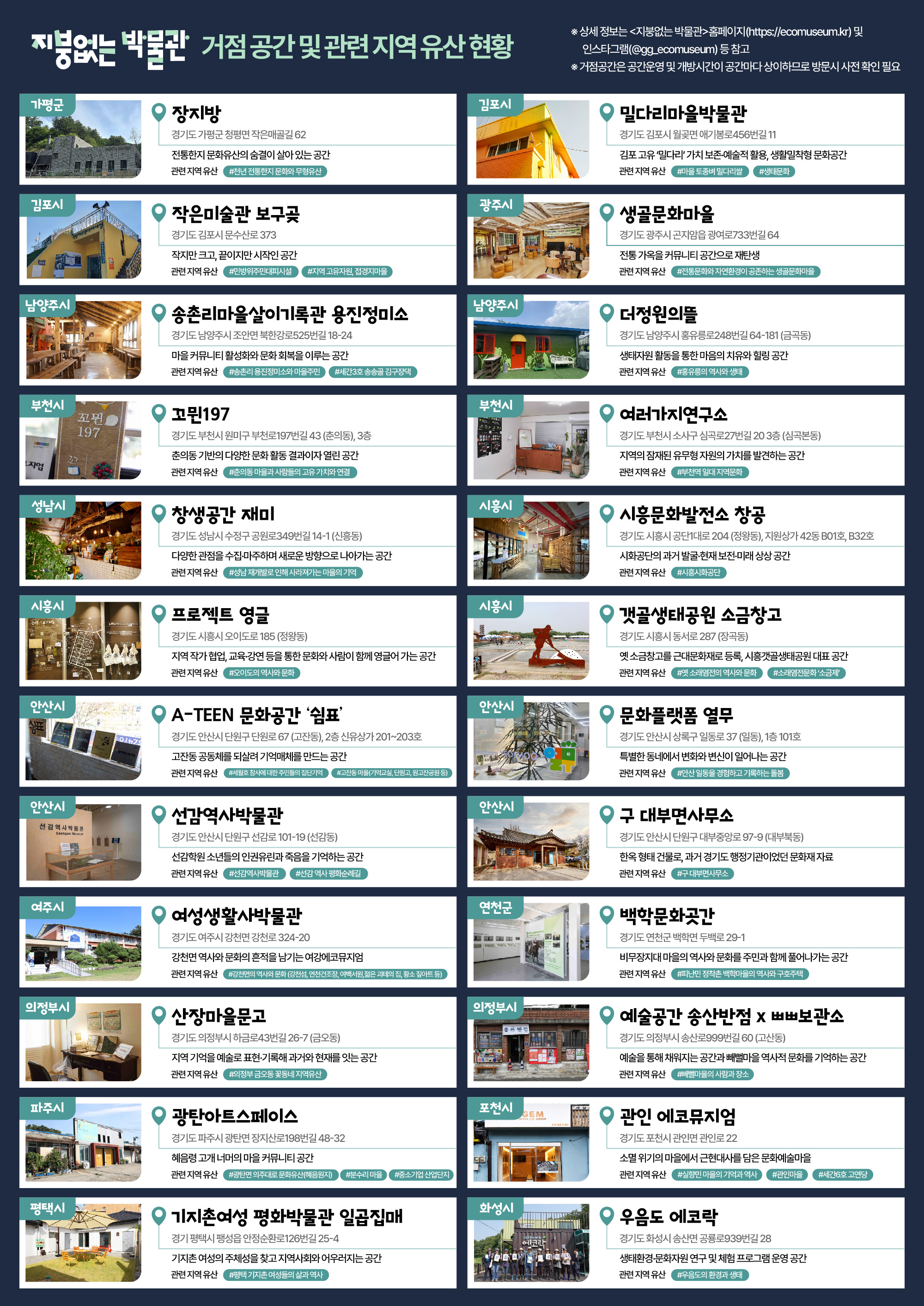 경기도와 경기문화재단은 우리가 살아가는 일상의 발자취를 ‘지붕없는 박물관’으로 만들어 가는 <지붕없는 박물관_경기에코뮤지엄> 사업을 추진하고 있습니다. 지붕없는 박물관은 지역 주민 스스로 자신과 이웃의 이야기, 문화와 생태 자원들을 탐색하고 주도적으로 관리하며, 마을 전체를 지붕없는 박물관으로 연결하는 활동을 육성합니다.