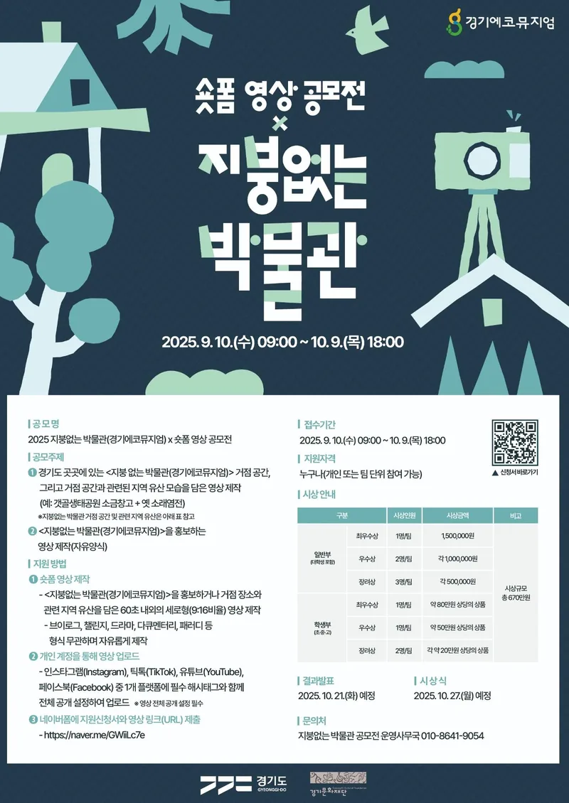 위 사업 10년차를 맞아 주민 스스로 <지붕없는 박물관_경기에코뮤지엄> 콘텐츠를 발굴할 수 있는 기회를 제공하고자 「2025 지붕없는 박물관x숏폼 영상 공모전」을 개최하오니 많은 관심과 참여 부탁드립니다.