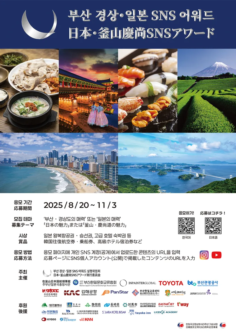올해 한일국교정상화 60주년을 기념하여 처음으로 개최되는 ‘부산 경상·일본 SNS 어워드’는 부산·경상도와 일본의 관광 진흥, 교류 촉진을 목적으로 합니다.