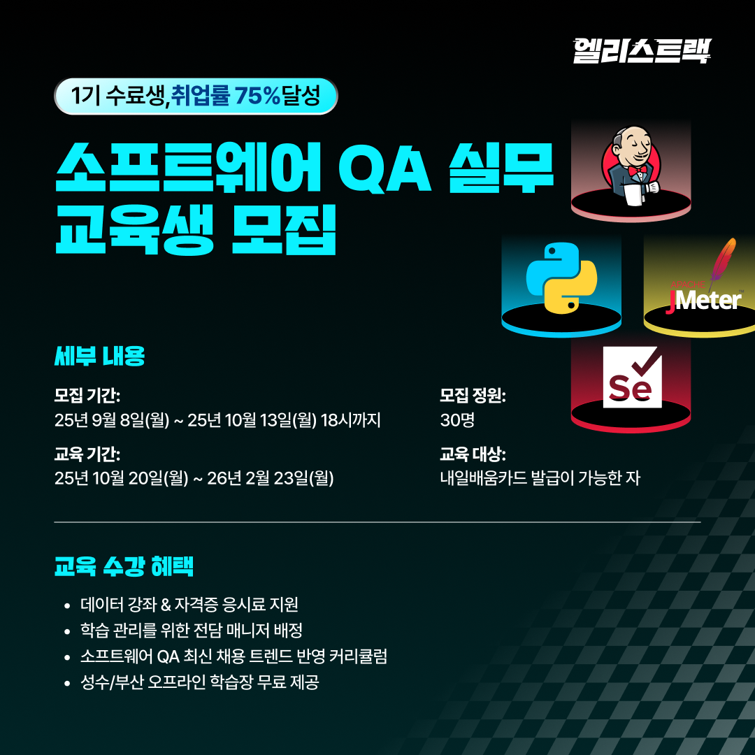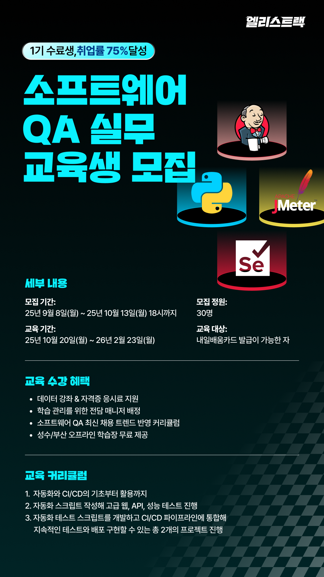 엘리스트랙 소프트웨어 QA 트랙은 테스트 이론부터 Selenium, Jenkins 등 자동화 실습까지 한 번에 하는 실무 중심의 부트캠프입니다.