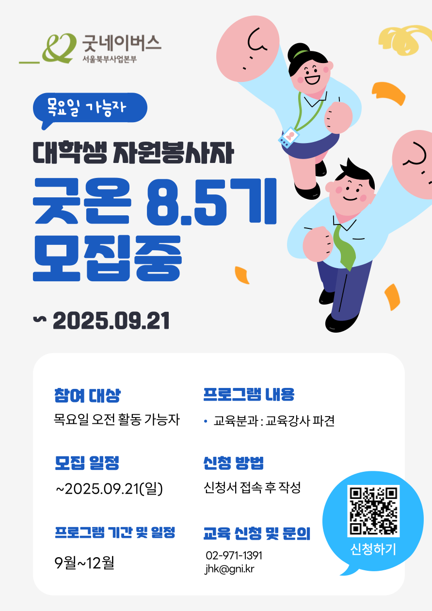 2025년 하반기 동안 굿네이버스와 함께 '세상을 위한 좋은 변화'를 만들어 나갈 봉사자를 모집합니다. 굿네이버스 서울북부사업본부에서는 대학생자원봉사동아리 '굿온'을 운영하고 있으며, 8.5기를 선발하고 있습니다.