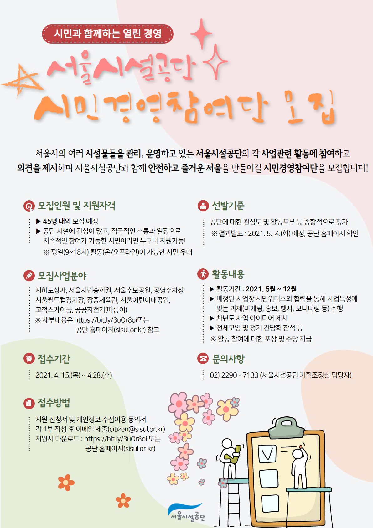 - 서울시설공단 시민경영참여단(시민위더스) 모집 (http://bit.ly/3uOr8oi)