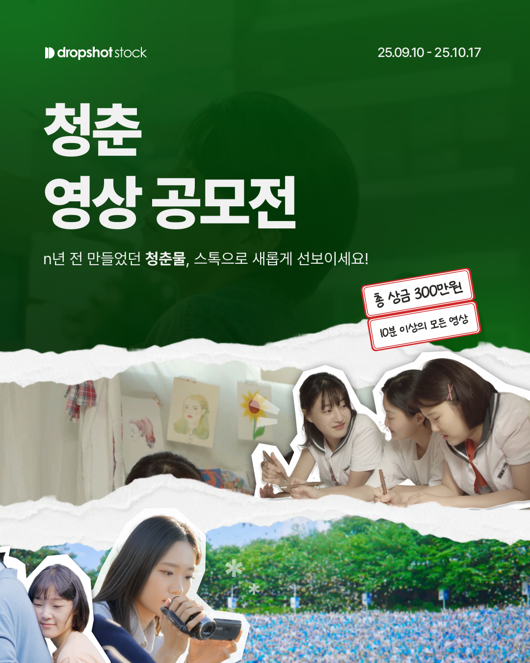 [드롭샷스톡 청춘 영상 공모전] 대학생 친구와의 우정을 다룬 단편 영화부터 꿈을 위해 밤낮없이 노력하는 청년의 다큐멘터리까지! n년 전 만들었던 청춘물, 스톡으로 더 넓은 세상에 선보이세요.