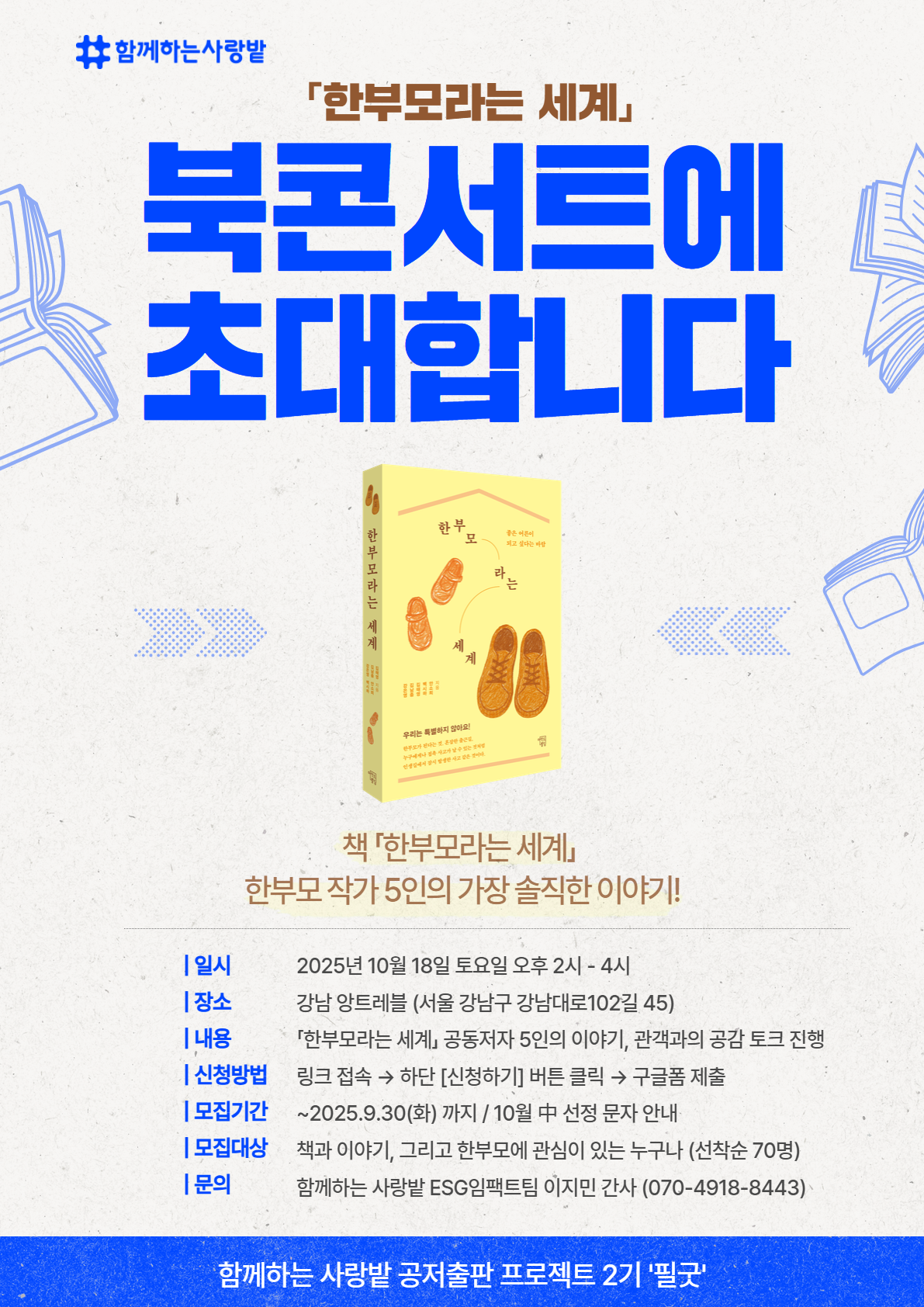 한부모 작가 5인이 직접 들려주는 솔직하고 희망 가득한 이야기를 함께 나누실 수 있도록 여러분을 초대합니다.