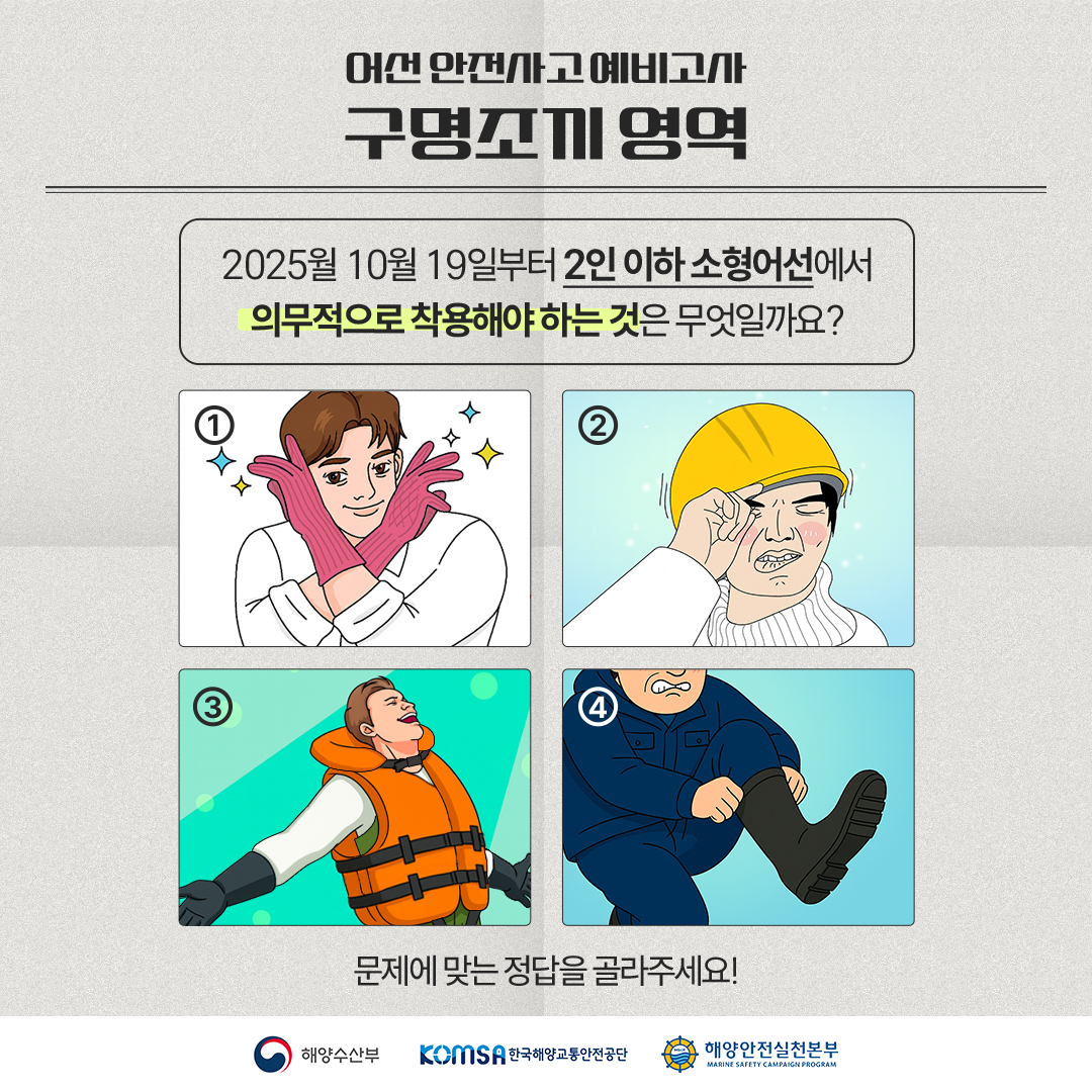 2인 이하 소형어선에서는 꼭~! 의무적으로 착용해야 하는 이것은 무엇일까요❓