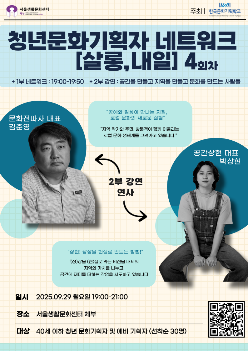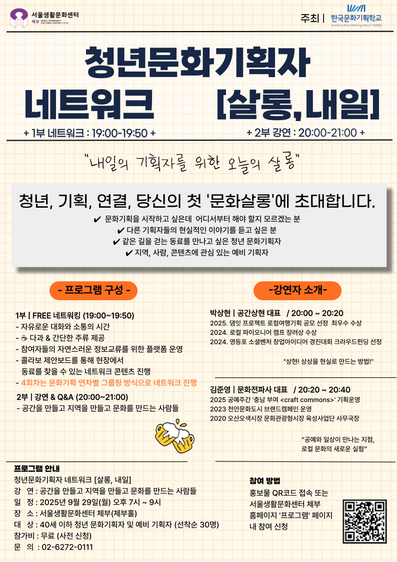 대상: 40세 이하 청년 문화기획자 및 예비 기획자 (선착순 30명, 무료)