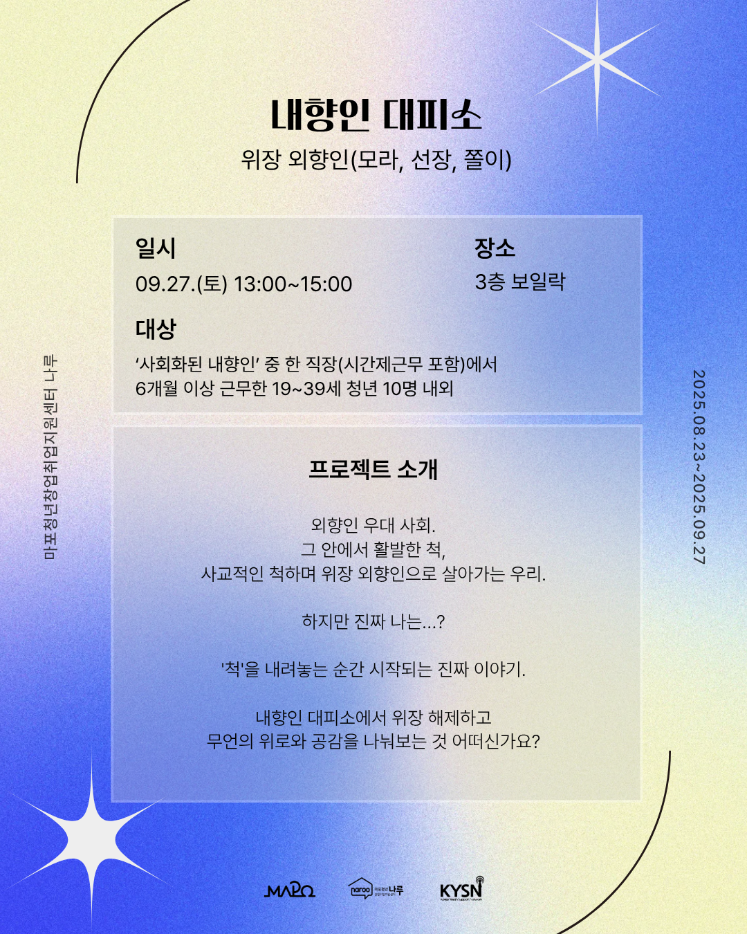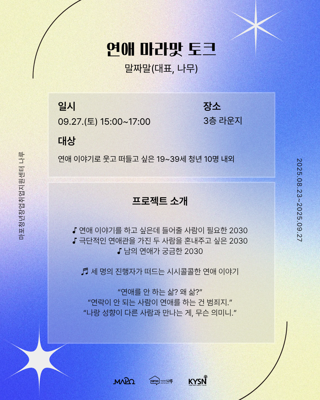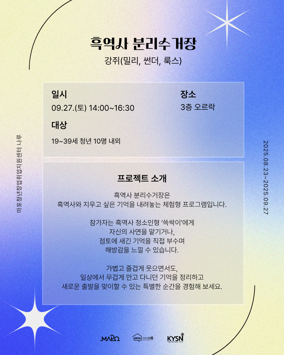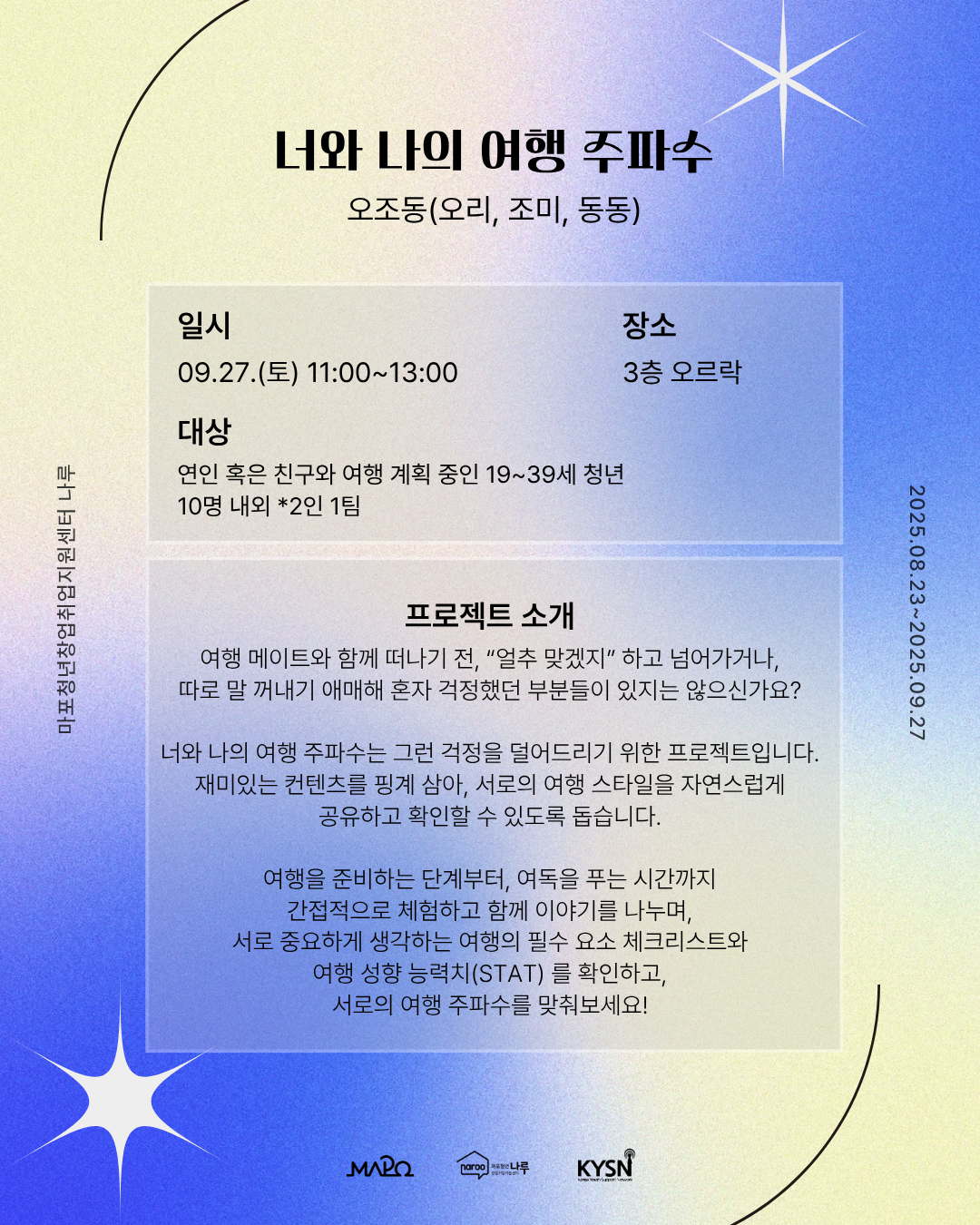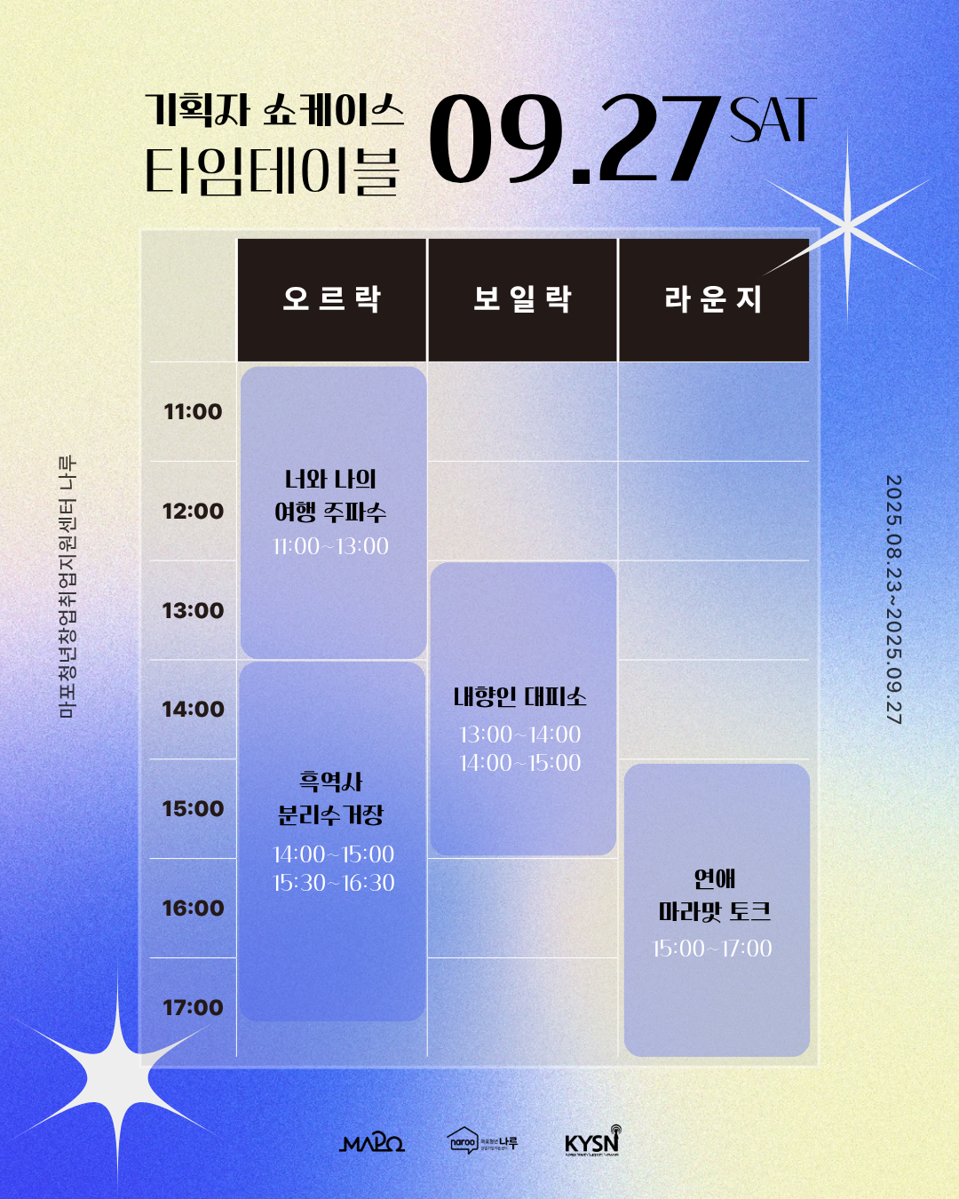 - 프로젝트 일시 : 2025.09.27.(토) 11-17시 *프로젝트 별 세부 내용 확인