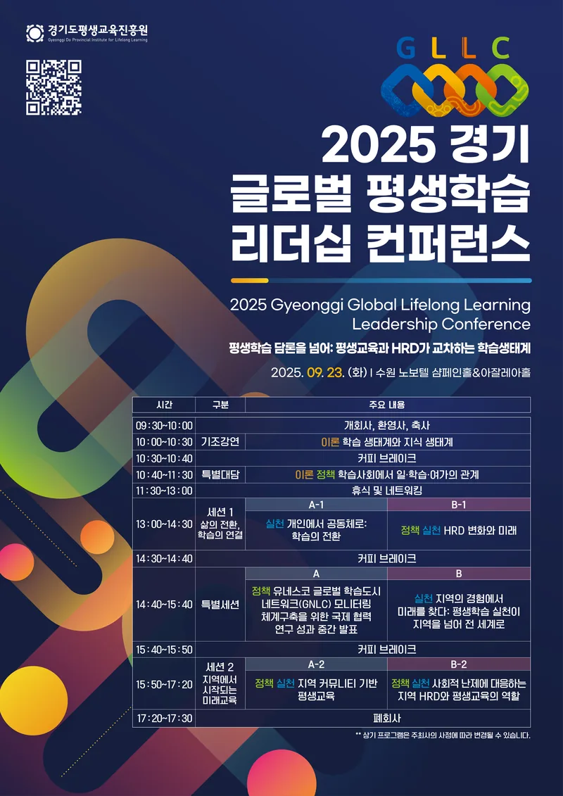 「2025 경기 글로벌 평생학습 리더십 컨퍼런스(GLLC)」가 수원에서 개최됩니다.
