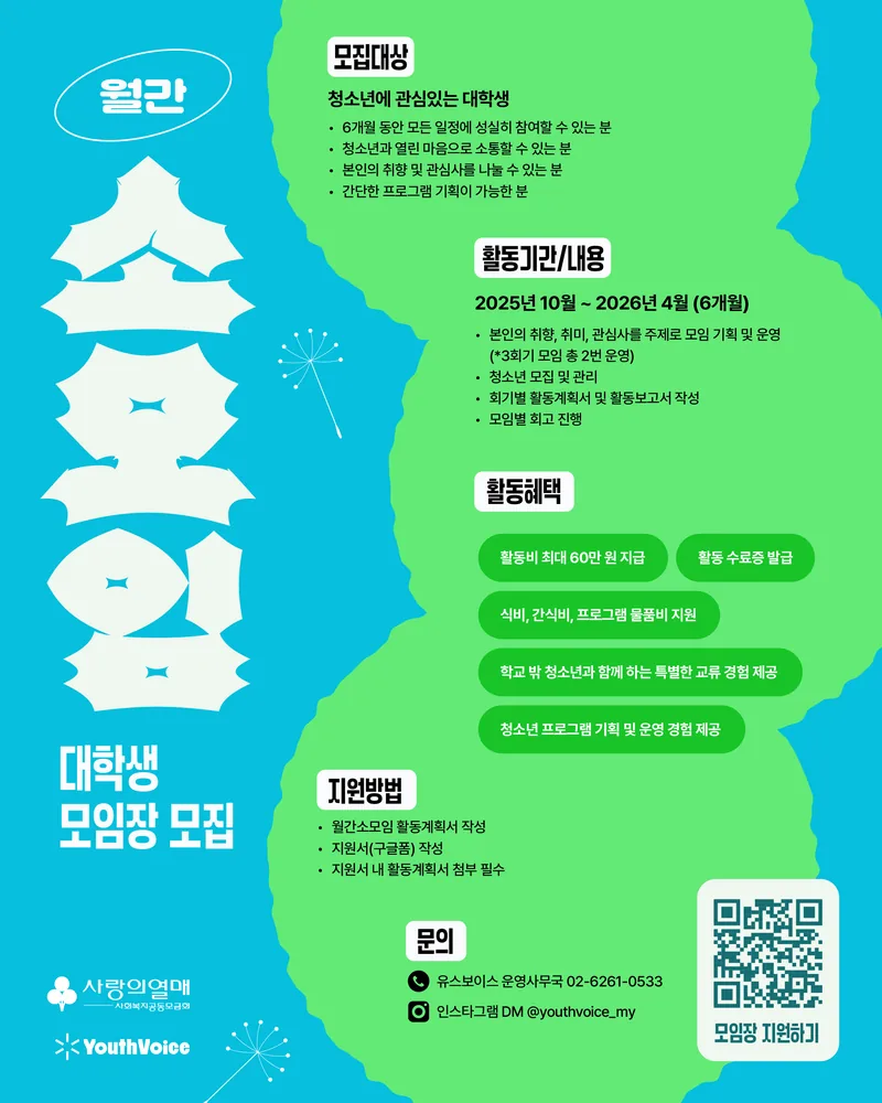 학교 밖 청소년과 함께하는 월간소모임의 대학생 모임장을 찾습니다!