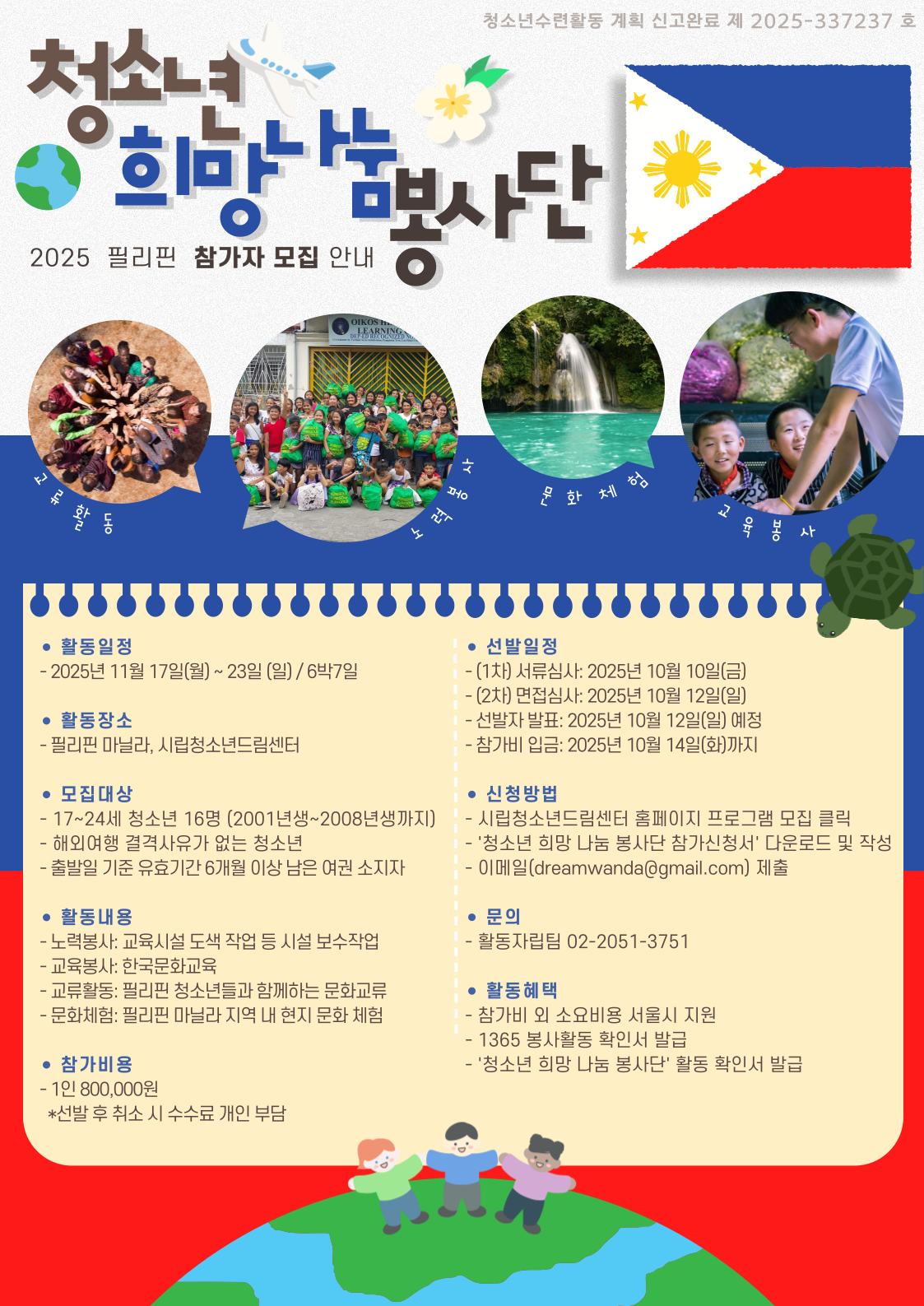 서울시립청소년드림센터에서 「2025 청소년 희망나눔 봉사단」 참가자를 모집합니다 ✈️