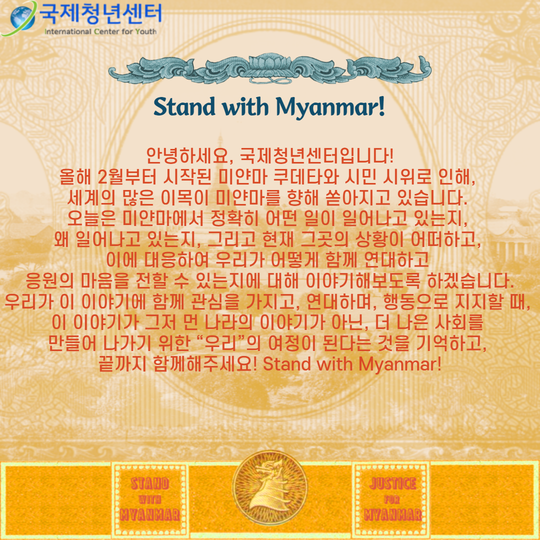 올해 2월부터 시작된 미얀마 쿠데타와 시민 시위로 인해 세계의 많은 이목이 미얀마를 향해 쏟아지고 있습니다. 오늘은 미얀마에서 정확히 어떤 일이 일어나고 있는지, 왜 일어나고 있는지 그리고 현재 그곳의 상황이 어떠하고, 이에 대응하여 우리가 어떻게 함께 연대하고 응원의 마음을 전할 수 있는지에 대해 이야기해보도록 하겠습니다. 우리가 이 이야기에 함께 관심을 가지고, 연대하며, 행동으로 지지할 때, 이 이야기가 그저 먼 나라의 이야기가 아닌, 더 나은 사회를 만들어 나가기 위한 “우리”의 여정이 된다는 것을 기억하고, 끝까지 함께해주세요! Stand with Myanmar!