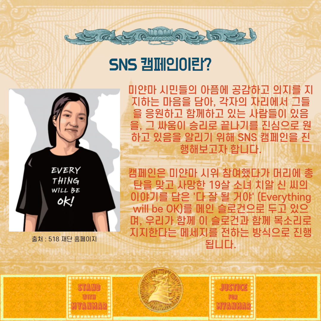 안녕하세요. 현재 국제청년센터에서는 미얀마 시민을 돕기 위해 다양한 활동을 진행하고 있습니다. 그중 저희는 sns 캠페인 팀 소속입니다.