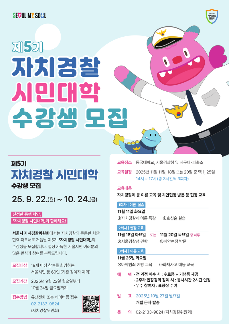 서울시 자치경찰위원회에서는 시민의 일상이 안전한 서울의 모습을 찾아보고, 알아가는 제5기 서울시 「자치경찰·인권 시민대학」 수강생을 모집하오니 열정 가득한 서울시민 여러분의 많은 관심과 참여를 부탁드립니다.
