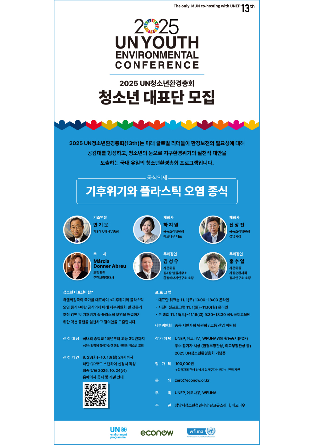 2025 UN청소년환경총회는 UNEP(유엔환경계획)과 에코나우, WFUNA(유엔협회세계연맹)이 공동주최하는 국내 유일 청소년환경총회입니다. 미래의 글로벌 에코리더들이 유엔회원국을 대표하여 모의유엔총회를 경험하고, 글로벌 지구환경 위기를 해결하기 위한 실천적 대안인 결의안과 액션플랜을 도출하는 프로그램입니다.