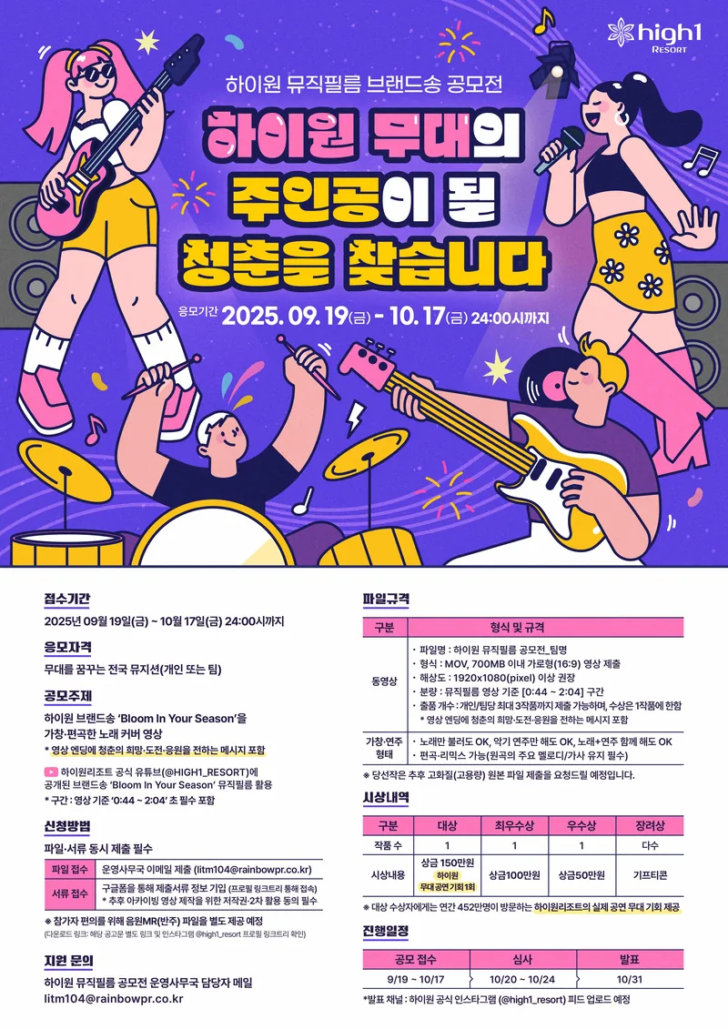- 대상(1팀) : 상금 150만원 + 하이원 소규모 무대 공연의 기회
