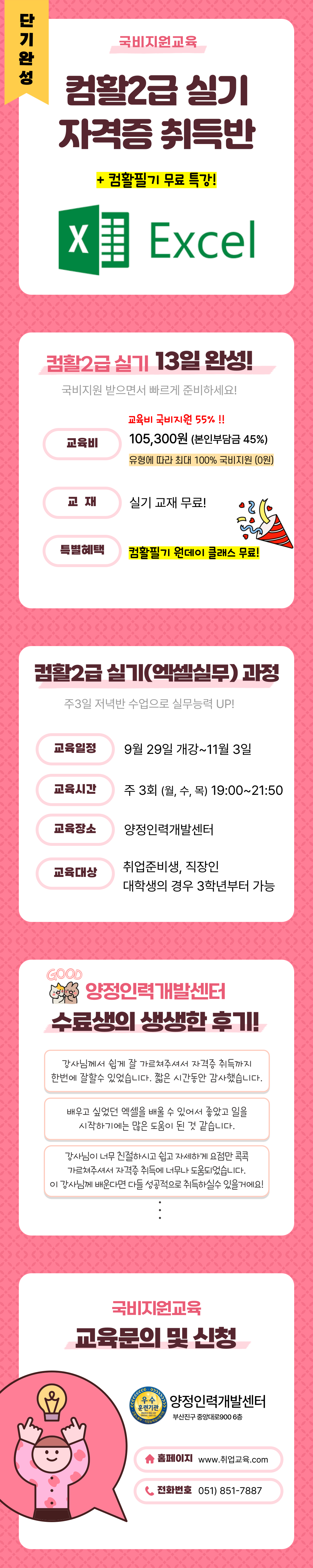 최대 100% 국비지원 받고! 단기간 컴활2급 실기(엑셀) 취득하자!