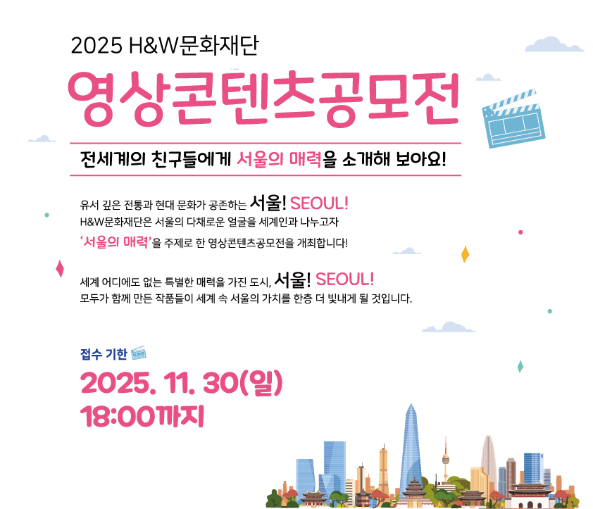 H&W문화재단은 이러한 서울의 다채로운 얼굴을 세계인과 나누고자, 서울의 매력을 주제로 한 영상콘텐츠공모전을 개최합니다.