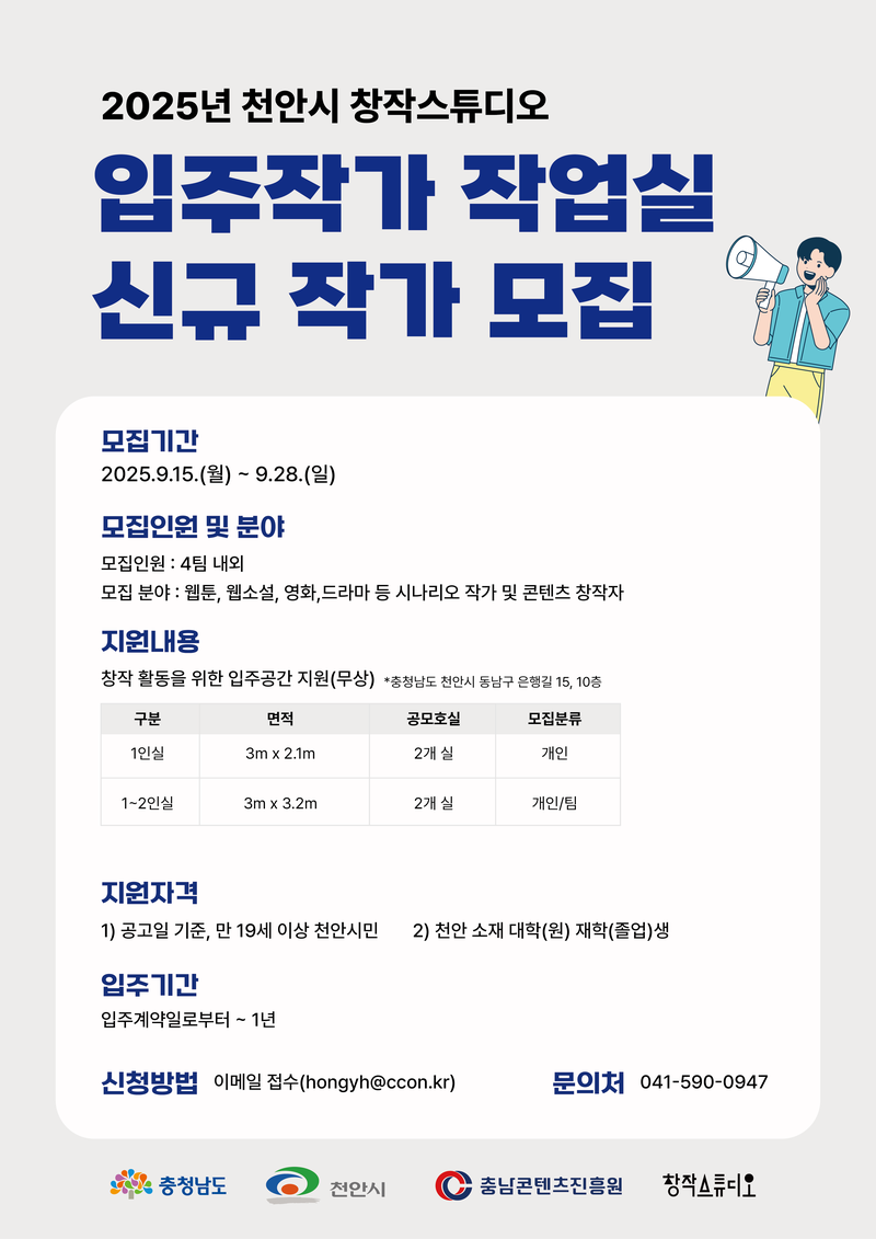 [천안시 창작스튜디오] 입주작가 작업실 신규 작가 모집 ~9.28.(일)
