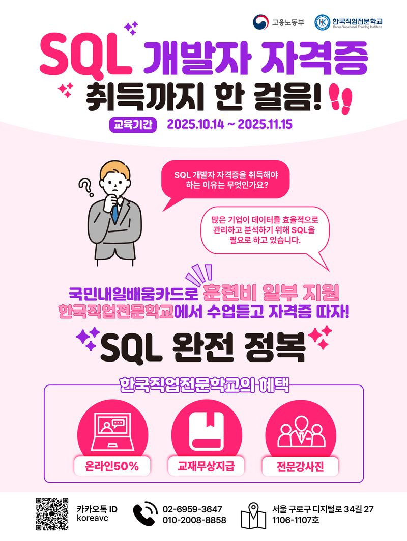 바쁜 여러분을 위해 50%의 주말 대면 교육은 서울 구로G밸리(한국직업전문학교)에서 진행합니다.