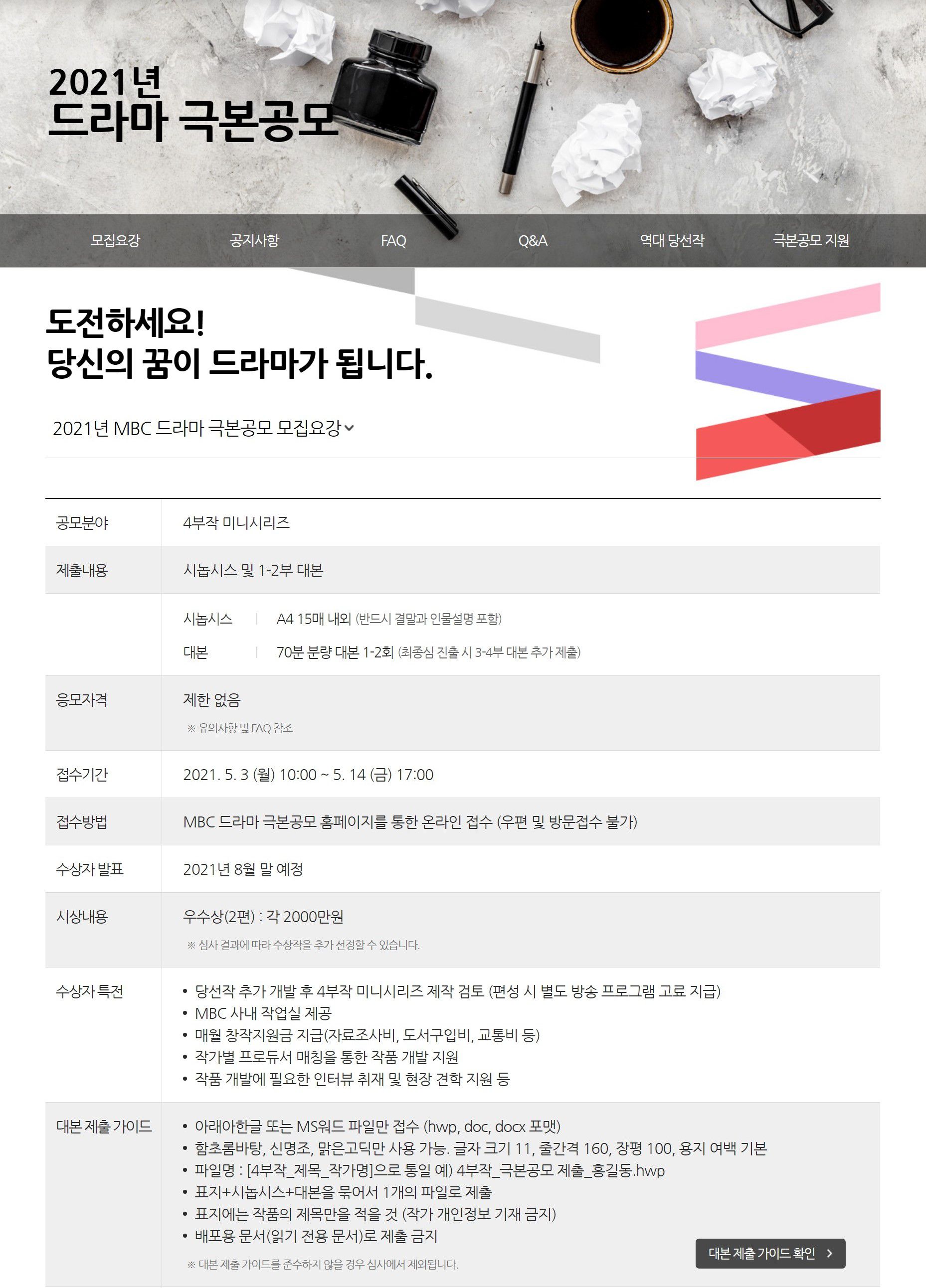 - MBC 드라마 극본공모 홈페이지를 통한 온라인 접수 (우편 및 방문접수 불가)