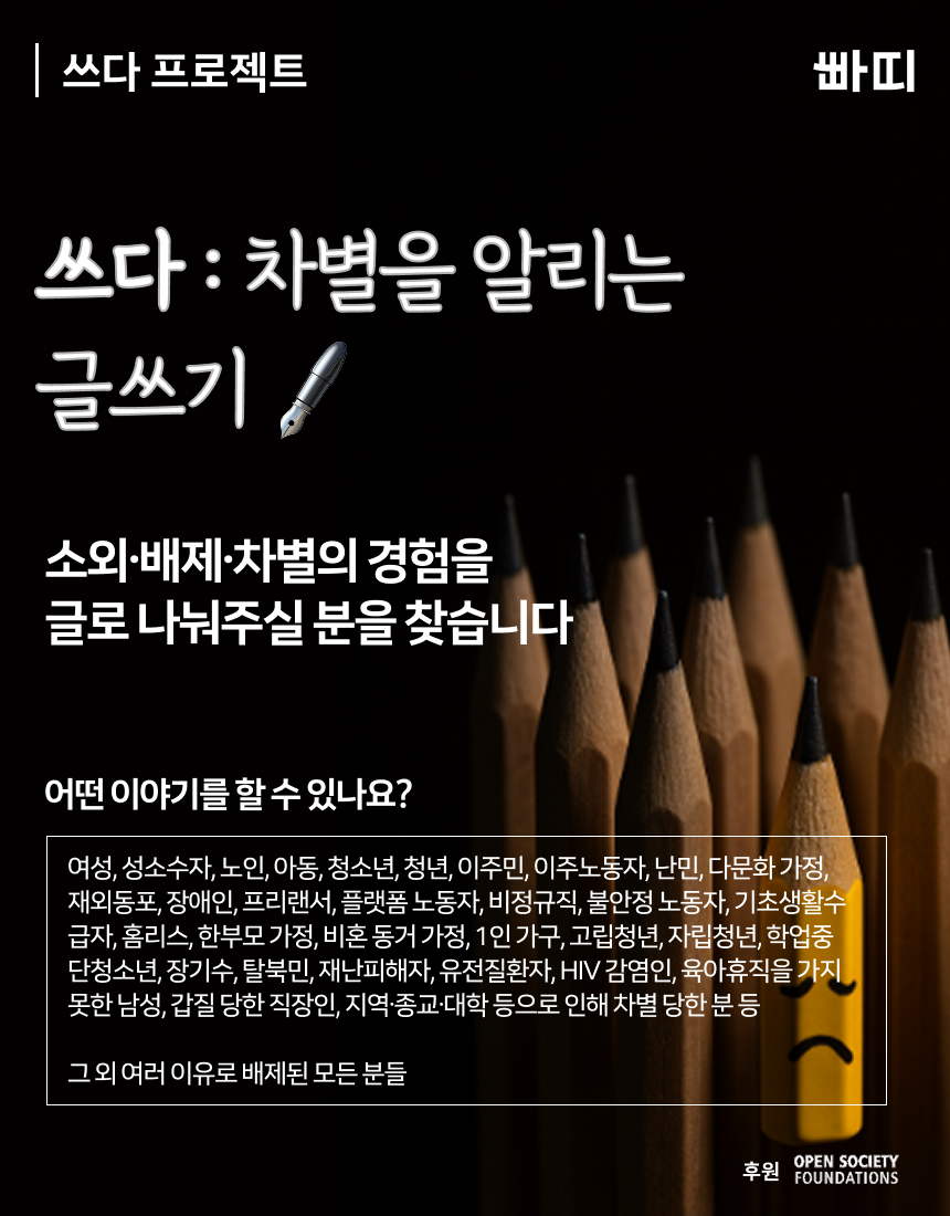 세상에 존재하는 다양한 배제와 소외, 차별에 대해 이야기 하고, 다양성이 보장되는 사회를 함께 고민하는 ‘쓰다: 차별을 알리는 글쓰기’ 프로젝트를 시작합니다.
