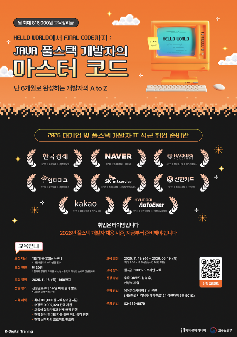 실제 현업에서 사용되는 JAVA, Spring, React/Vue.js 등 풀스택 개발 기술과 Database 분석을 바탕으로, 단 6개월 만에 개발자 실무의 전 과정을 경험하고, 기업 연계 프로젝트와 1:1 취업 코칭을 통해 탁월한 개발 실력과 압도적인 취업 경쟁력을 완성할 수 있습니다.