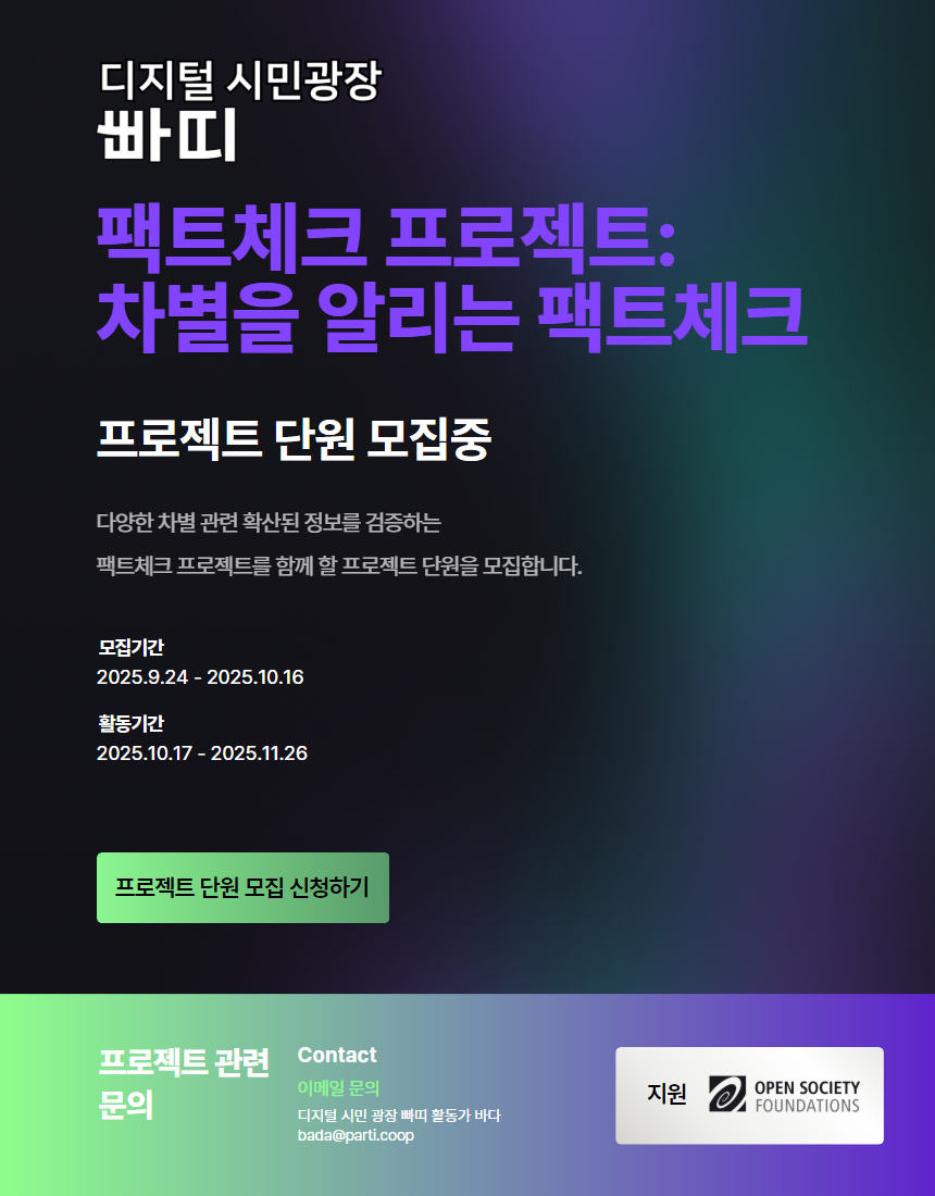 팩트체크 프로젝트 모임은 디지털 시민 광장 빠띠 디스코드에서 진행되며, 프로젝트 관련 정보는 디스코드 내 ‘kfc-시민팩트체커’ 채널에서 공유합니다.