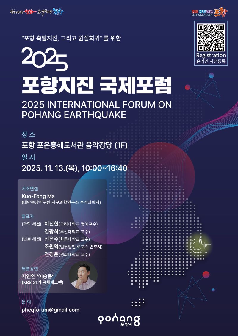 2025년 11월 13일, 포항 포은흥해도서관에서 포항시가 주최하는 2025 포항지진 국제포럼이 개최됩니다!