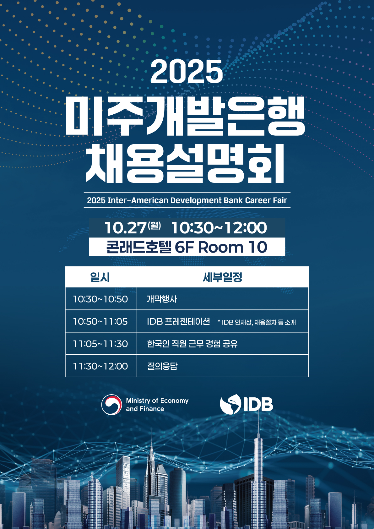 채용모집과 더불어, 미주개발은행 채용설명회는 10/27(월) 오전 10시 30분에 콘래드호텔 6층 10번 방에서 진행됩니다. 많은 참석 부탁드립니다.