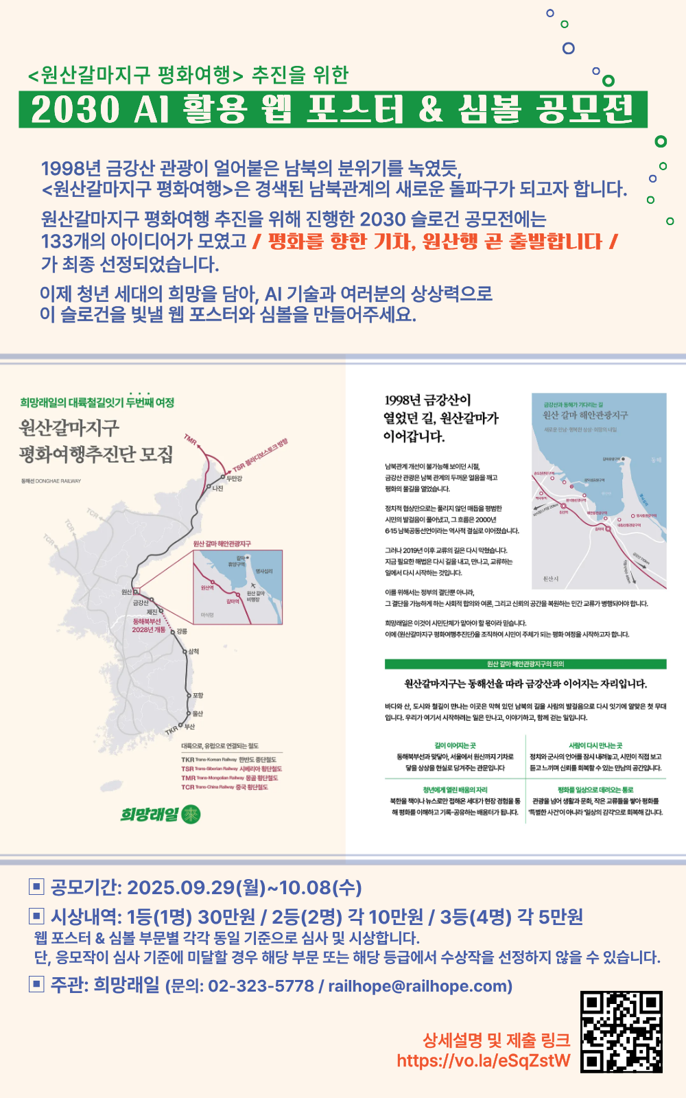 1998년 금강산 관광이 얼어붙은 남북의 분위기를 녹였듯, <원산갈마지구 평화여행>은 경색된 남북관계의 새로운 돌파구가 되고자 합니다. 그 첫걸음으로 진행한 2030 슬로건 공모전에는 133개의 아이디어가 모였고, / 평화를 향한 기차, 원산행 곧 출발합니다 / 가 최종 선정되었습니다. 이제 청년 세대의 희망이 담아, AI 기술과 여러분의 상상력으로 이 슬로건을 빛낼 심볼과 웹 포스터를 만들어주세요.