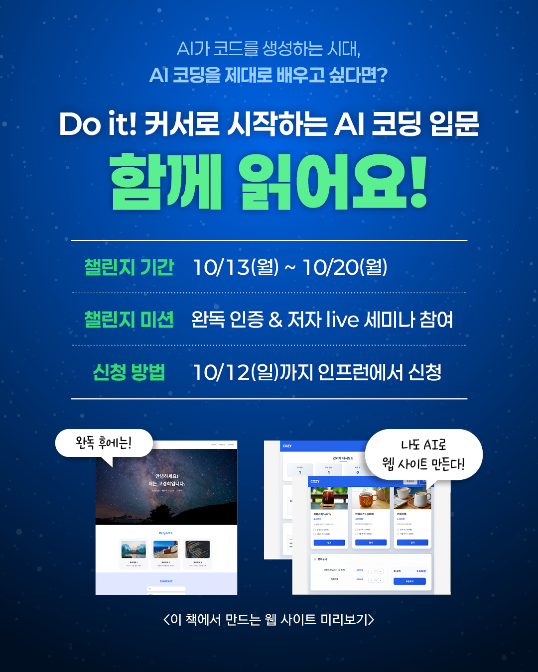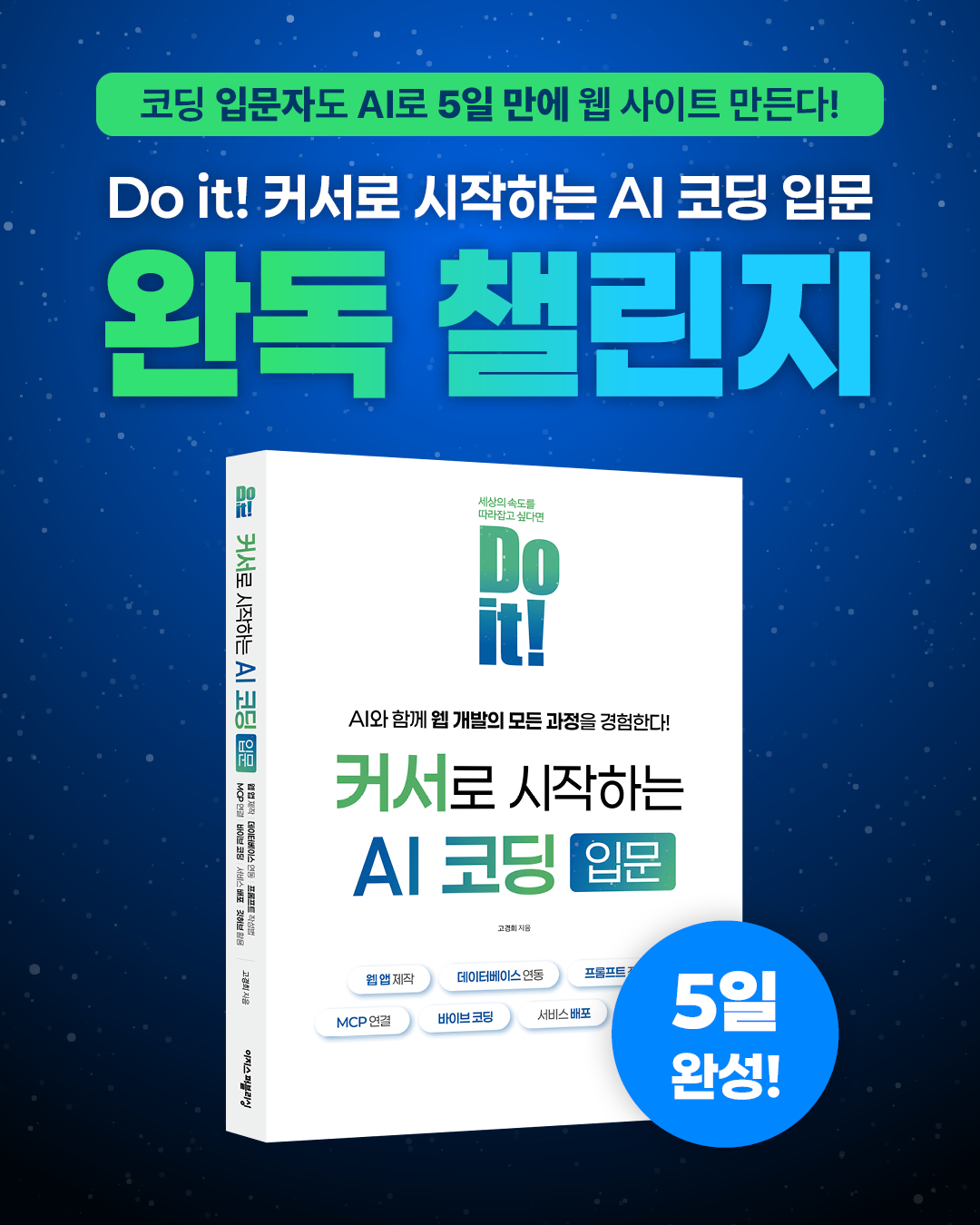 웹 개발 기초부터 AI 코딩 서비스인 커서 활용법까지 차근차근 배우고, 직접 나만의 웹 페이지를 만들어 보는 실습을 할 수 있는 《Do it! 커서로 시작하는 AI 코딩 입문》이 출간되었습니다.