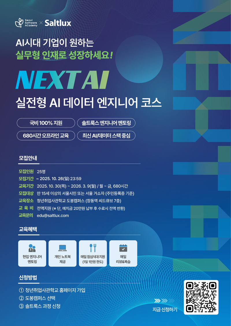 대한민국 최초 인공지능 상장기업이자 서울시 선정 SeSAC 우수 운영기관 솔트룩스에서 기업주도 맞춤형 데이터 엔지니어링 과정 듣고 예비 엔지니어로 거듭나보세요!