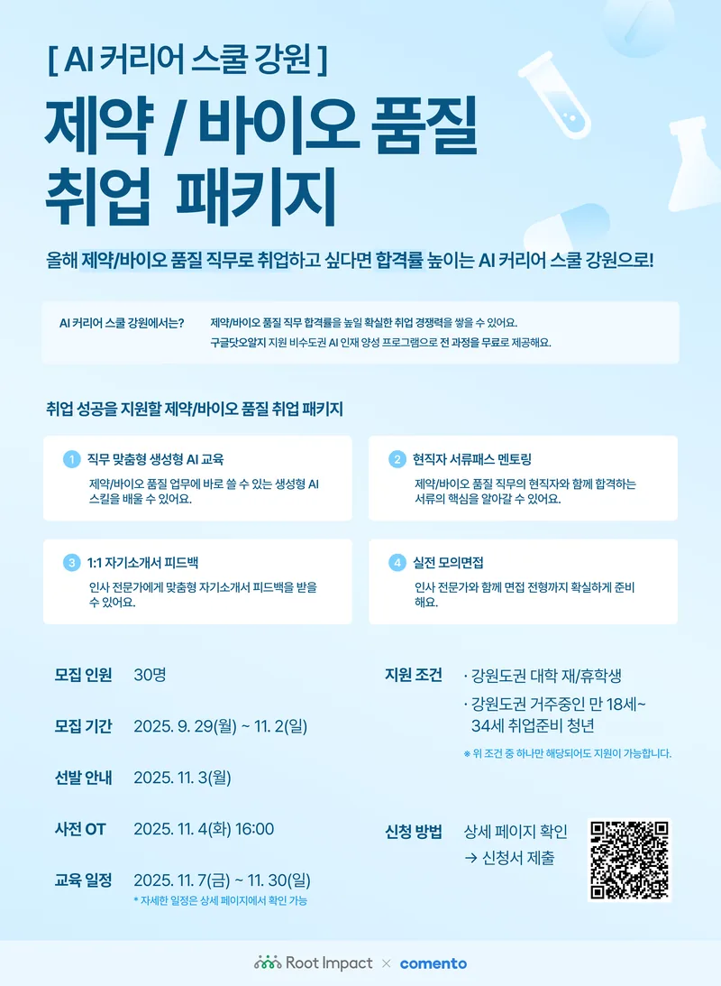 - 제약/바이오 품질 직무 맞춤형 생성형 AI 교육부터 서류와 면접 준비까지, 확실한 취업 경쟁력을 쌓을 수 있어요.