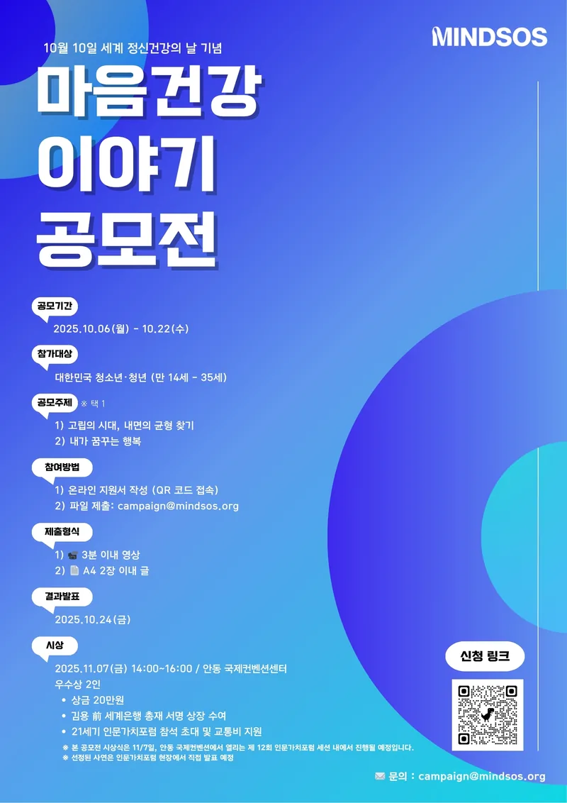 MINDSOS에서 청소년·청년을 대상으로 마음건강 이야기를 담은 공모전을 진행합니다.