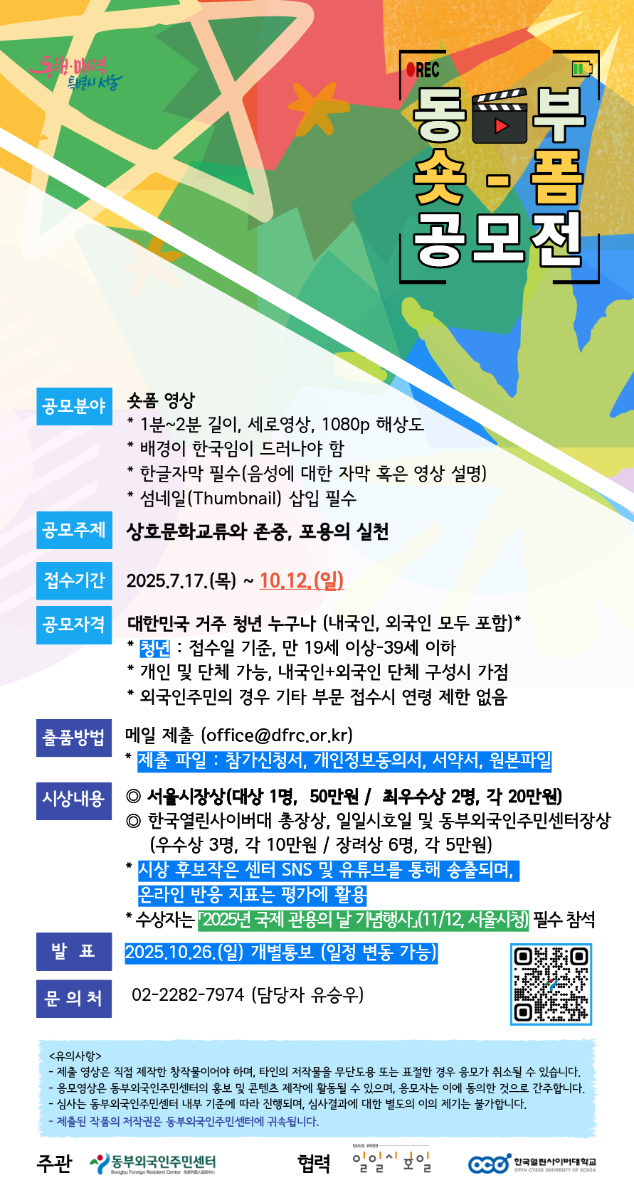 한국에서 생활하는 청년(만 19-39세)이라면 누구나 참여할 수 있는 숏폼 영상 공모전 접수기간이 10월 12일(일)까지 연장 되었습니다!