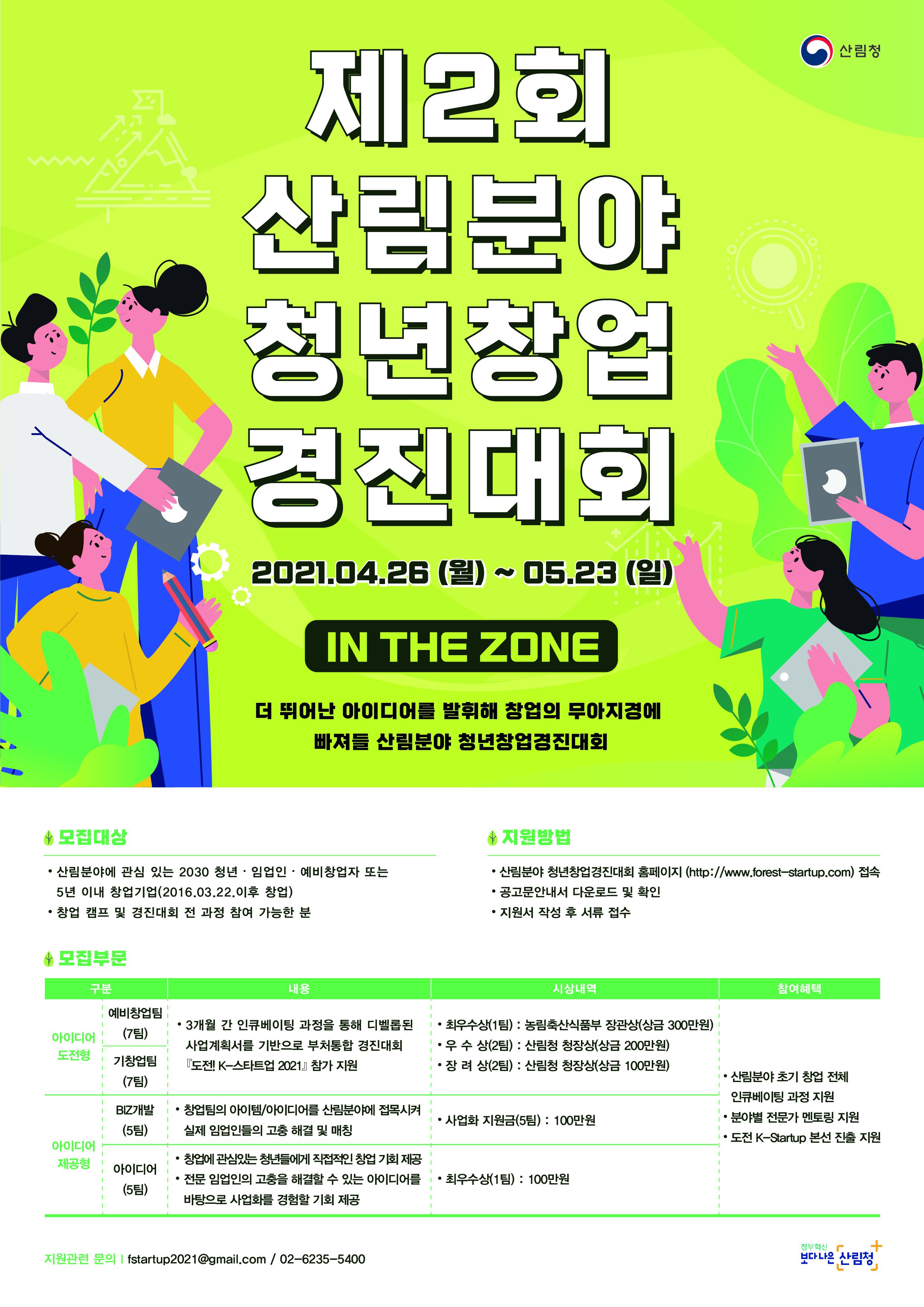 제2회 산림분야 청년창업 경진대회는 참가자의 수준에 맞춘 최적의 보육 프로그램을 통해 자신의 능력을 최대한 발휘함으로써 진정한 창업의 세계를 경험할 수 있는 창업 지원 프로그램입니다.