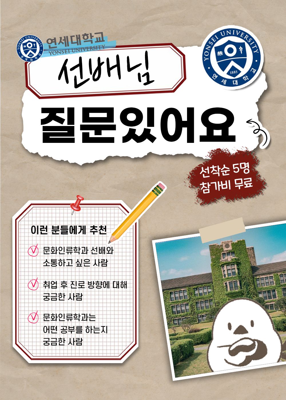 - 모집대상 : 연세대 문화인류학과을 희망하는 사람 (다른 과에 대한 질문에는 충분한 답변을 못받을 수 있습니다😅)