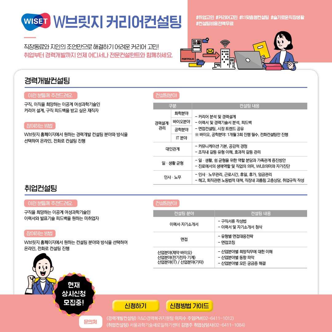 2) 신청방법: http://www.wbridge.or.kr → 새로운 WISET 플랫폼 W브릿지에서 신청