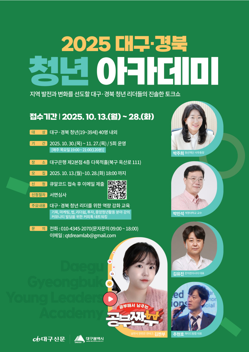 대구광역시와 대구신문(주)에서는 대구 경북 청년들을 대상으로 지역 현안을 이해하고 글로벌 소통능력을 갖춘 미래혁신 인재육성을 위해 2025 대구·경북 청년 아카데미 참가자를 모집합니다.