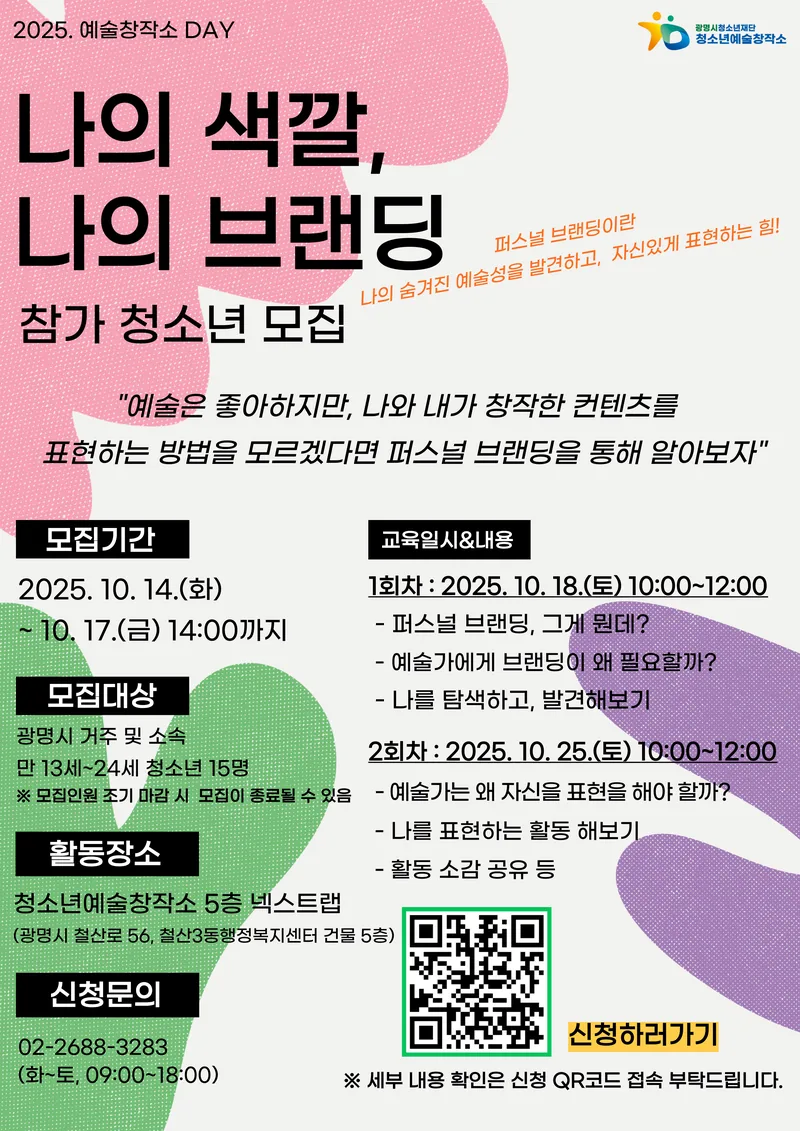 [나의 색깔, 나의 브랜딩]은 예술가로서의 ‘나’를 발견하고, 작품과 일상 속에서 나만의 색깔과 개성을 표현하는 방법을 함께 배우는 시간입니다.