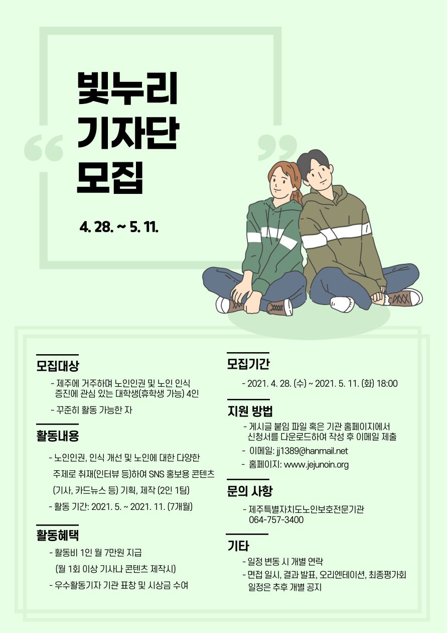 - 노인 인권, 노인 인식 개선 및 노인에 대한 다양한 주제로 취재하여 SNS 홍보용 콘텐츠(기사) 기획 및 작성(기본 2인 1조 월 1건 이상)